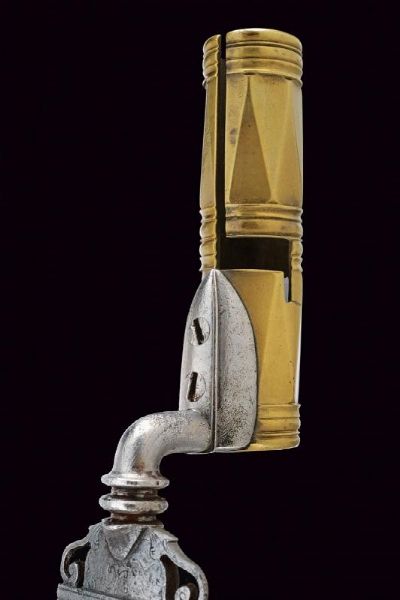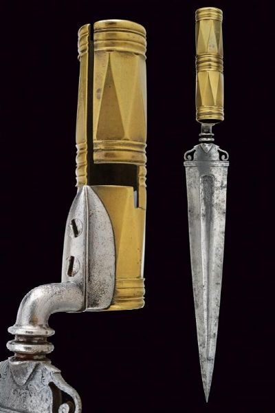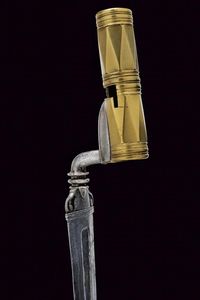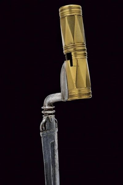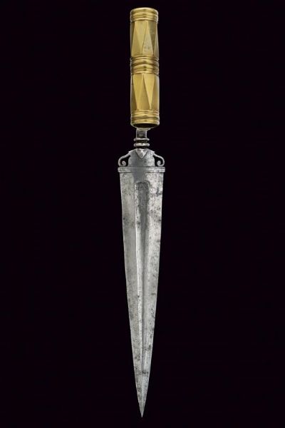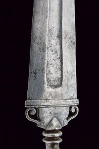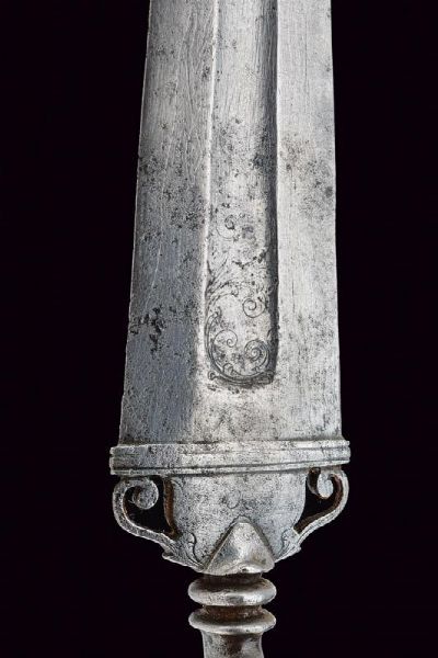 Lama dritta a due fili sgusciata centralmente e con resti di incisioni. Tallone traforato ed inciso. Manicotto in bronzo decorato a triangoli e con anellature trasversali.