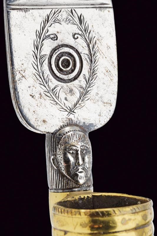 Lama dritta a due fili con sguscio centrale; il tallone intagliato ed inciso a motivi floreali e geometrici. Il nodo intagliato con un volto barbuto. Manicotto liscio in ottone con anellature alle estremità .