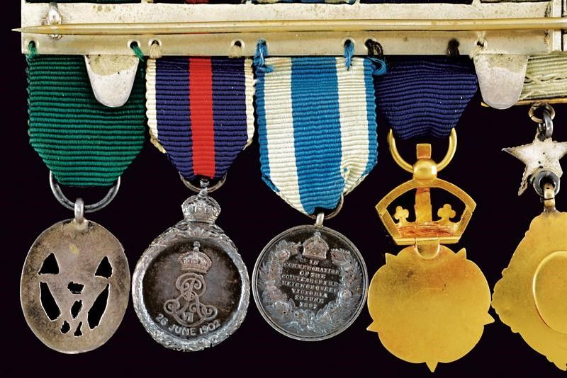 1900 circa Ordine della Stella d'India, dorato e smaltato; Ordine dell'Impero Indiano, dorato e smaltato; e altre tre medaglie d'epoca vittoriana. Tutte con nastrini.