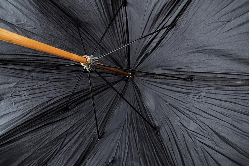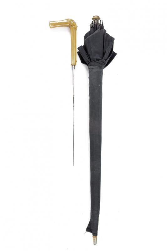 Europa, lunghezza 48,3 cm. inizio del XX Sec. Corta lama dritta a un filo (lievi intaccature). Impugnatura in corno chiaro di mucca, dotata di pulsante di rilascio. Fodero a bastone con ombrello in tela nera (ben conservata, con minimi difetti). Piede metallico. Lunghezza totale da chiuso: 90,5 cm. Raro.