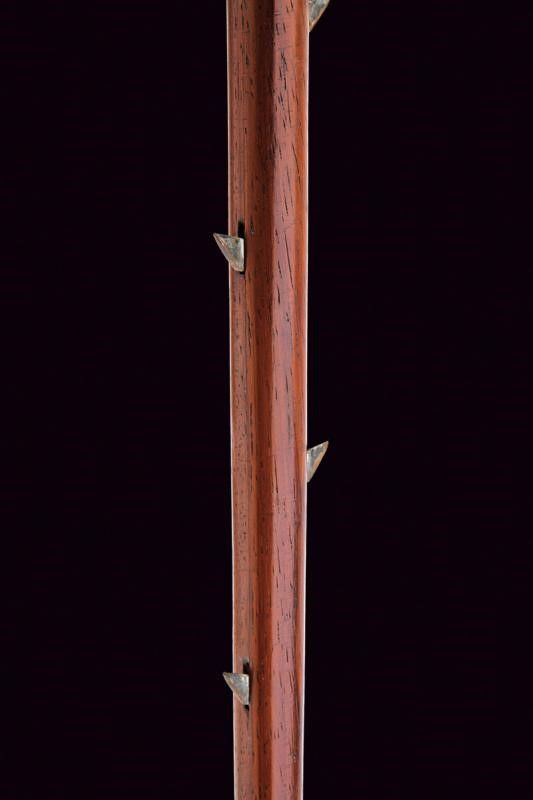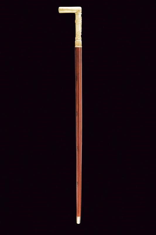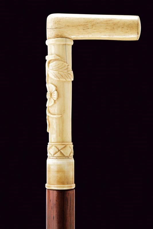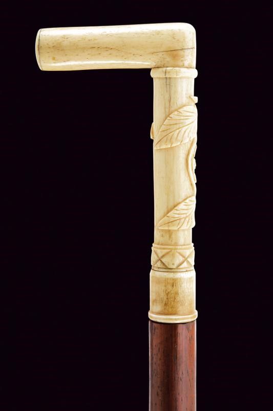 Francia, lunghezza 85,3 cm. Fine del XIX Secolo Impugnatura formata da elementi in corno di cervo, di forma angolata con bel decoro floreale ad intaglio. Il fusto ligneo munito di lame o becchi a scomparsa che fuoriescono tirando l'impugnatura. Il piede in corno (restaurato?). Raro.