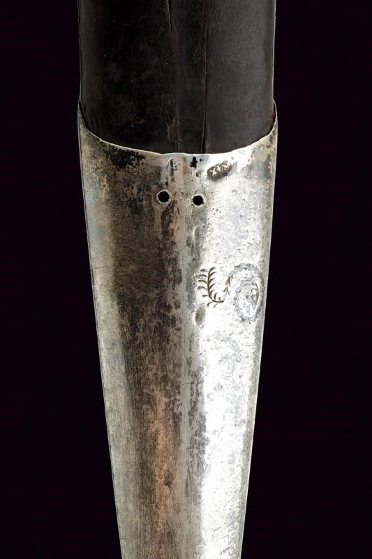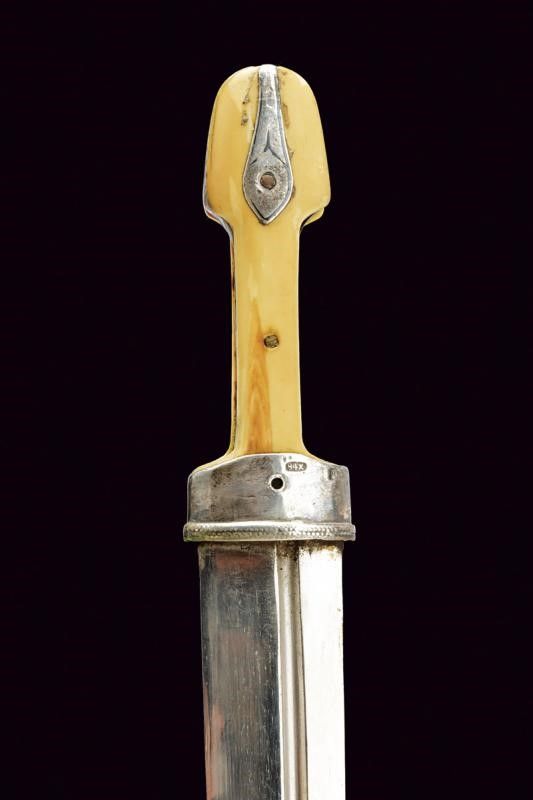Caucaso, lunghezza 55.5 cm. 1900 circa Lunga lama dritta a due fili con profonde scanalature asimmetriche e resti di un'inscrizione. Impugnatura con guance in zanna di tricheco e fornimenti in argento incisi e niellati a motivi floreali e geometrici. Punzone '84' e un altro marchio poco leggibile. Fodero in legno rivestito di cuoio con fornimenti in argento recanti punzoni russi.
