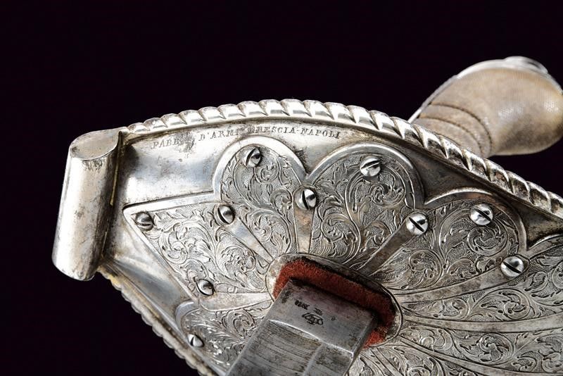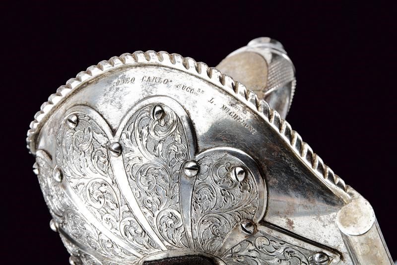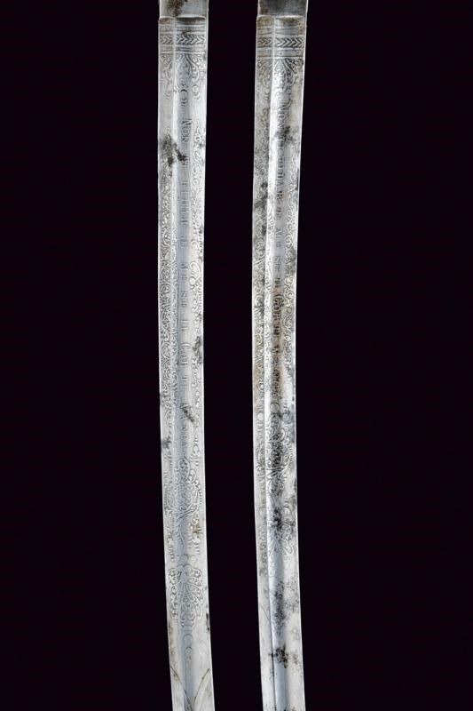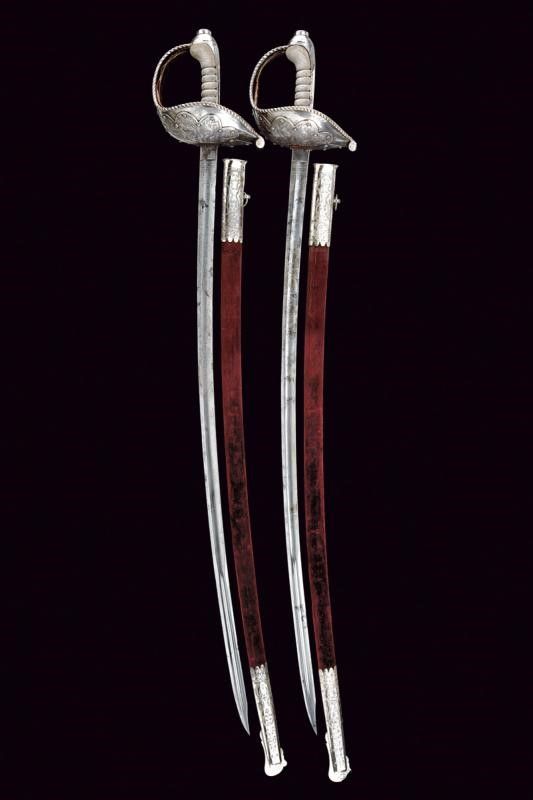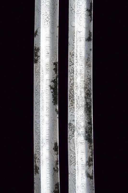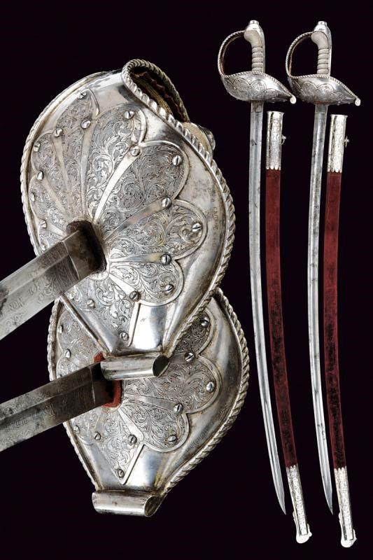 Italia meridionale, lunghezza 101.5 cm. Seconda metà del XIX Secolo Lame curve a un filo e controfilo con sguscio che diviene duplice al debole, recanti su un lato al forte l'iscrizione 'NON TI FIDAR DI ME SE IL COR TI MANCA' e sull'altro il motto 'IL COR DEL CALABRESE E' COR D'ACCIAIO', entrambi i motti fra incisioni a motivi floreali. I talloni marcati con corona, 'M' e con due altri punzoni poco visibili. Bei fornimenti con ampia guardia in ferro con bordo rialzato e lavorato a fingere il tortiglione; la superficie esterna rinforzata da una placca intagliata a fiore incisa a racemi e fissata con una serie di viti; su un lato incisione 'BODEO CARLO SUCC.RE L. MICHELONI' e dalla parte opposta 'FABB.TE D'ARMI BRESCIA-NAPOLI'. L'interno del fornimento rivestito di velluto bordeaux (danni d'uso e del tempo) con banda in canutiglia dorata. Impugnature in pelle di pesce a settori suddivisi da filo metallico. Capette lunghe. Foderi in legno rivestiti di velluto bordeaux e con fornimenti in ferro; cappa munita di campanella e puntale incisi a motivi floreali.