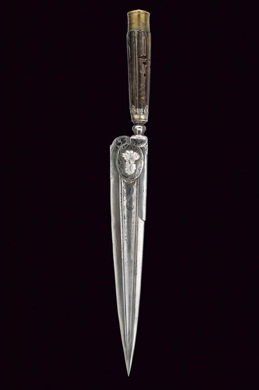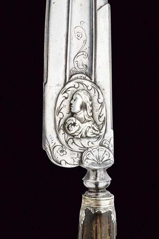 Napoli, lunghezza 40.2 cm. Robusta lama dritta a un filo e controfilo con sguscio centrale, recante alla base con busto di un uomo su un lato e di una dama sull'altro, entrambi rimessi in argento in bassorilievo. Impugnatura in corno nervato (mancanze e fori di tarlo). Ghiera incisa e lavorata a fogliame (mancanze). Il pomo cilindrico in ottone.
