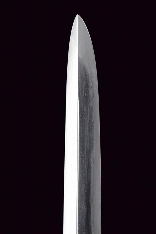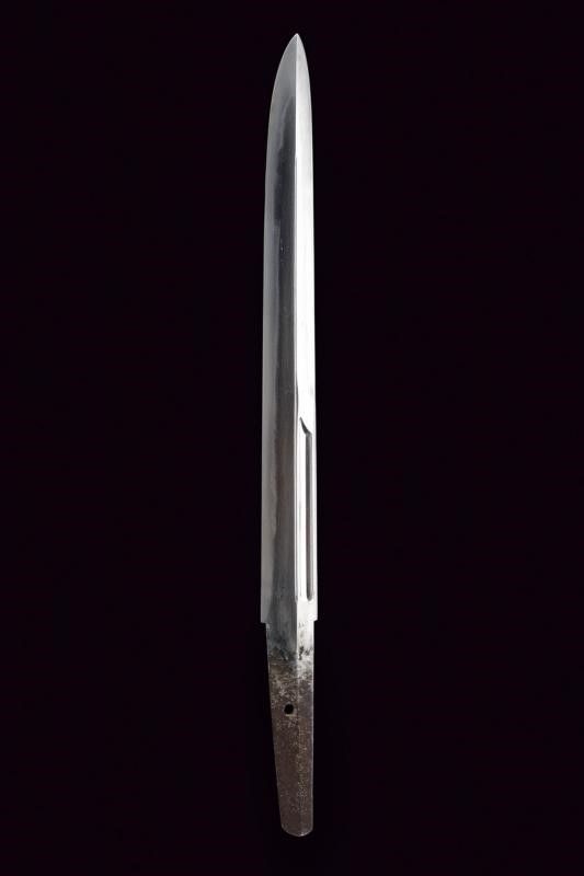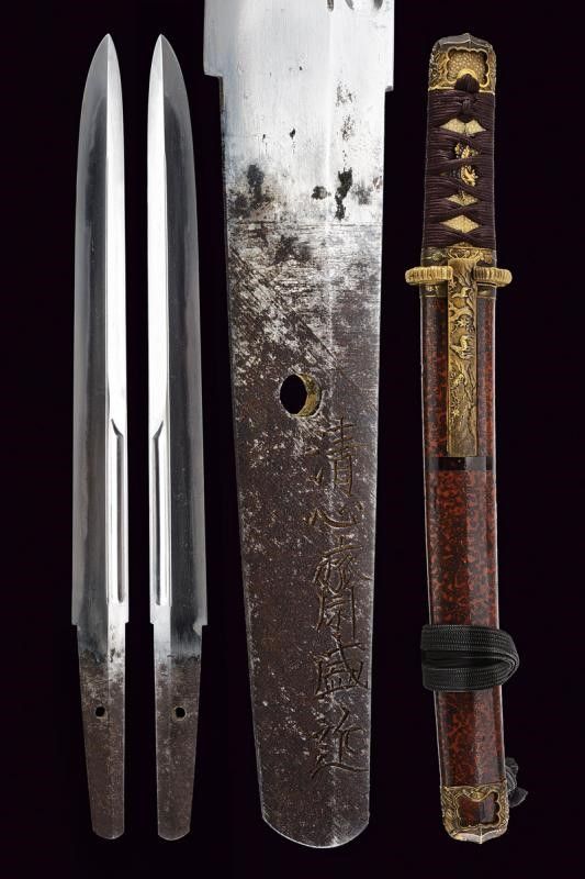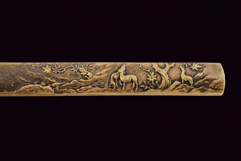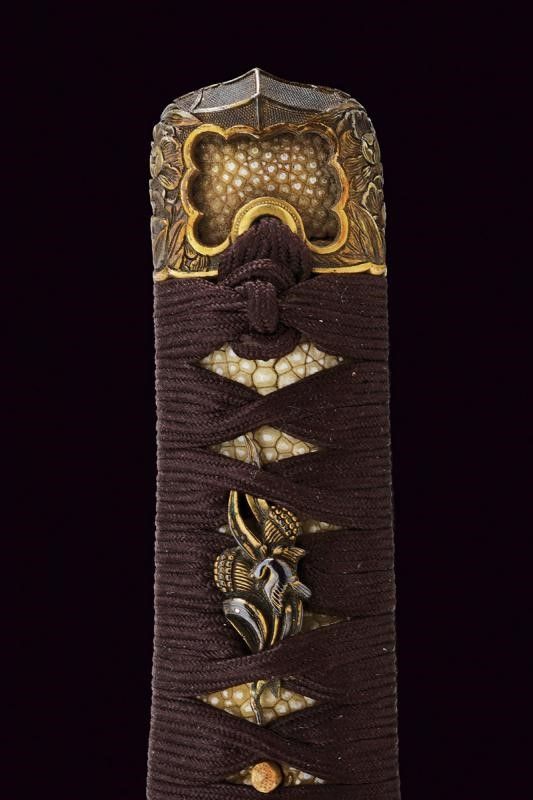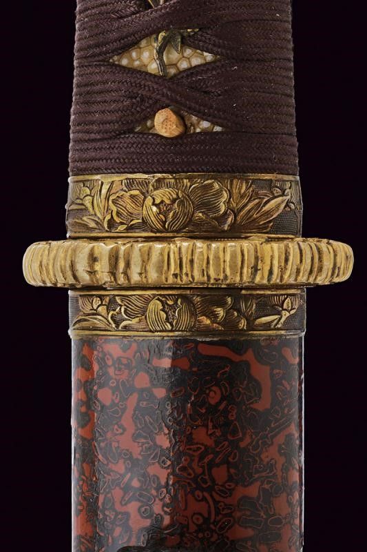 Giappone, lunghezza 39.8 cm. Periodo Edo (1603-1867) Lama Kogarasumaru Zukuri, con Nagasa di 25.4 cm. Hada: itame con nie-deki, Hamon: suguha; Habaki in rame. Nakago mei: 'Seishinsai Morichika'. Koshirae contemporaneo con fornimenti in shakudo decorati con peonie su fondo nanako. Tsuba in shakudo decorata a fogliame. Menuki parzialmente dorati. Tsuka-ito in seta marrone scuro. Bella saya in lacca rossonera. Kozuka con cervi in campagna, Kogatana firmata 'Etchu (no) kami Masatoshi'. Periodo Edo, epoca Bunkyu / Genji (1861-1864).