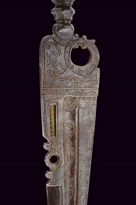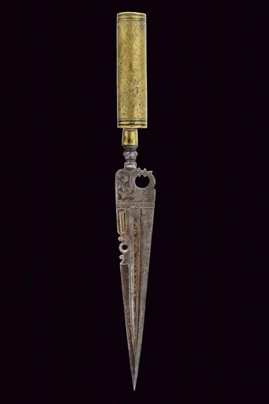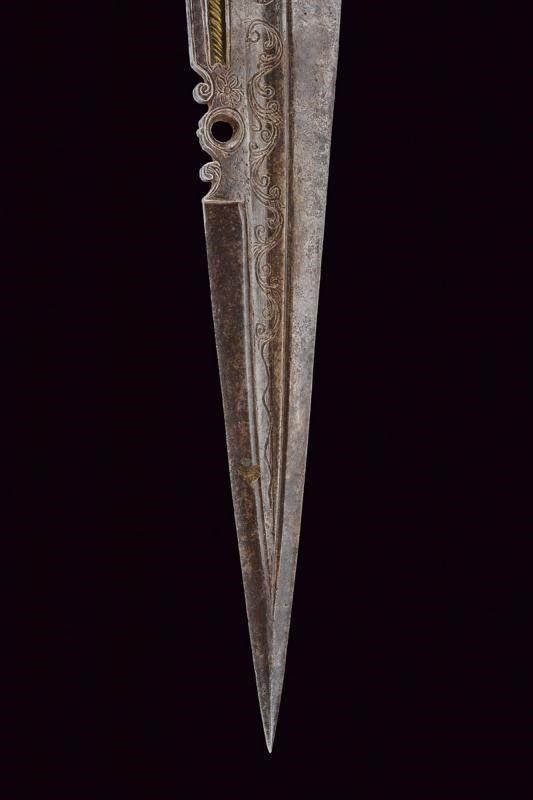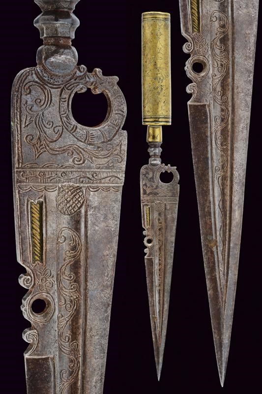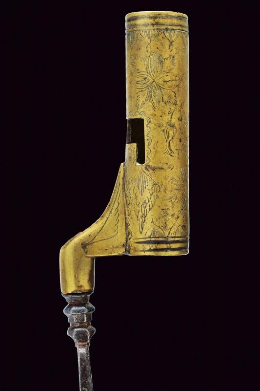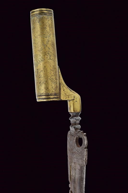 Italia meridionale, lunghezza 32.3 cm. Lama dritta a un filo e controfilo con profonda scanalatura centrale incisa. Il dorso, sotto al controfilo, intagliato, inciso e dotato di occhio traforato al di sotto del quale e presente una collanina in ottone. Il tallone intagliato ed inciso con un drago e decorato a motivi floreali. Collo e manicotto in ottone, il secondo finemente inciso a motivi floreali.