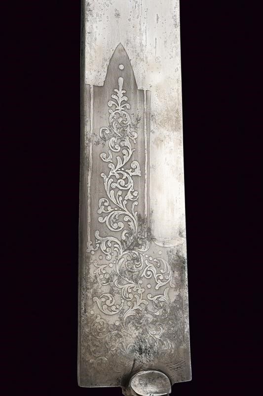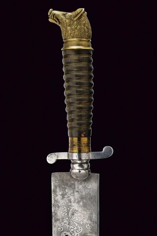 Italia meridionale, lunghezza 51.2 cm. Larga lama a un filo e controfilo leggermente sgusciata sotto al dorso, finemente incisa all'acquaforte a motivi floreali su fondo opaco al forte. Piccolo elso a 'S' in ferro. Impugnatura in corno a spire (piccole mancanze) con trecciola in filo di ottone, ghiera incisa a fogliame, il pomo in ottone a testa di cinghiale. Fodero in cuoio con fornimenti in ottone decorati a motivi floreali.