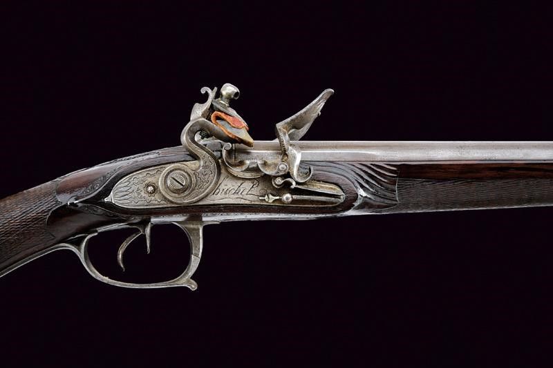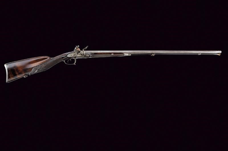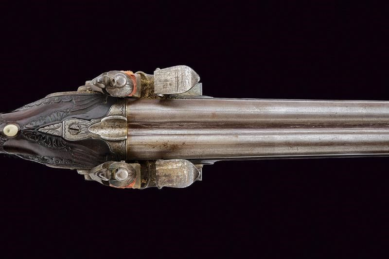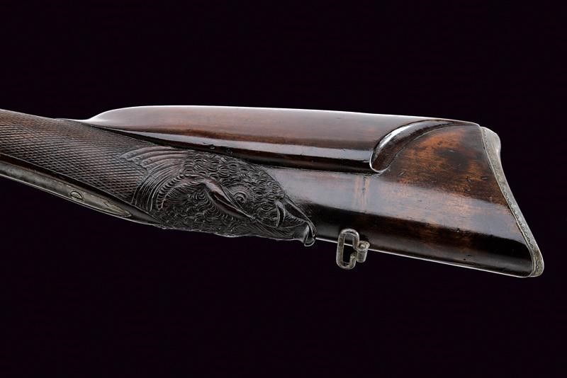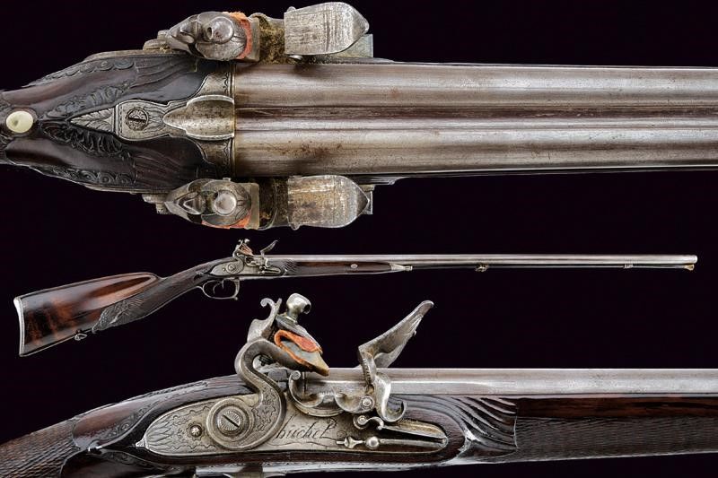 Francia, lunghezza 131.5 cm. Canne lisce tonde con base quadra, marcatura '24' sul lato sinistro, bindella e mirino, cal. 15 mm. Codetta incisa e dotata di traguardo a sella. Batterie firmate 'Buchet' e 'Chalon' incise a motivi floreali e munite di sistema antifrizione e a tenuta stagna. Meccanica funzionante. Mezza cassa in legno con astina e collo zigrinati, il calcio finemente scolpito con una testa di cinghiale. Fornimenti in ferro incisi a motivi floreali e a temi venatori. Bacchetta in legno con battipalla in ottone.
