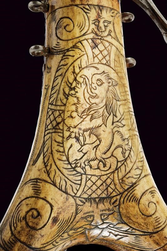 Germania, altezza 19.3 cm. Corpo in corno di cervo di forma biforcuta, la superficie anteriore liscia e finemente incisa con raffigurazione di un leone rampante entro una serto floreale, circondato da riccioli e mascheroni, in basso la data '1557'. I fornimenti ed il gancio da cintura in ferro. Quattro anelli di sospensione.