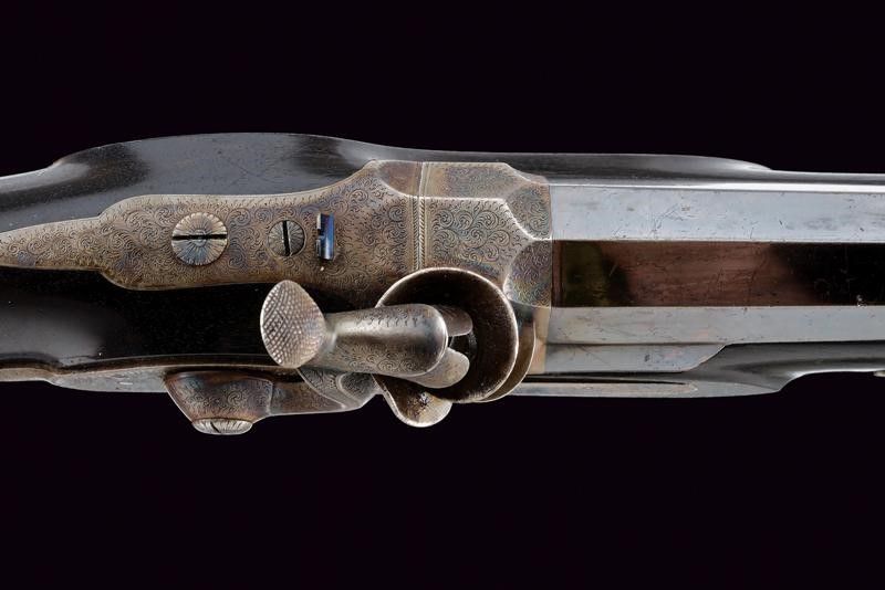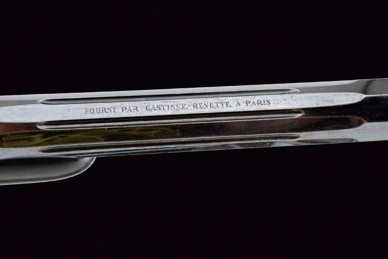 Canna rigata, a tre ordini, lavorata nel segmento centrale a sedici facce con sottili scanalature e marcatura 'FOURNI PAR GASTINNE-RENETTE A PARIS'; le estremità a ettagoni, la base finemente incisa a motivi floreali e geometrici, la volata con mirino di precisione, cal. 11.3 mm; codolo inciso en suite con la base, dotato di traguardo regolabile brunito color blu. Batteria a luminello a molla in avanti, cartella piatta con codetta ribassata, finemente incisa a motivi floreali e geometrici. Cassa a tre quarti in ebano con calcio micro-zigrinato e fornimenti parzialmente bruniti con finissime incisioni floreali, il ponticello con monogramma 'EB' in oro ed argento. Nella sua cassetta in legno rivestita internametne con panno verde, completa di tutti gli attrezzi e della chiave. Il coperchio con lo stesso monogramma della pistola.