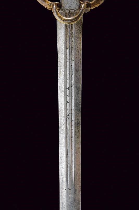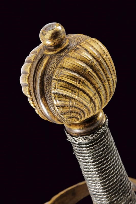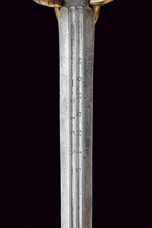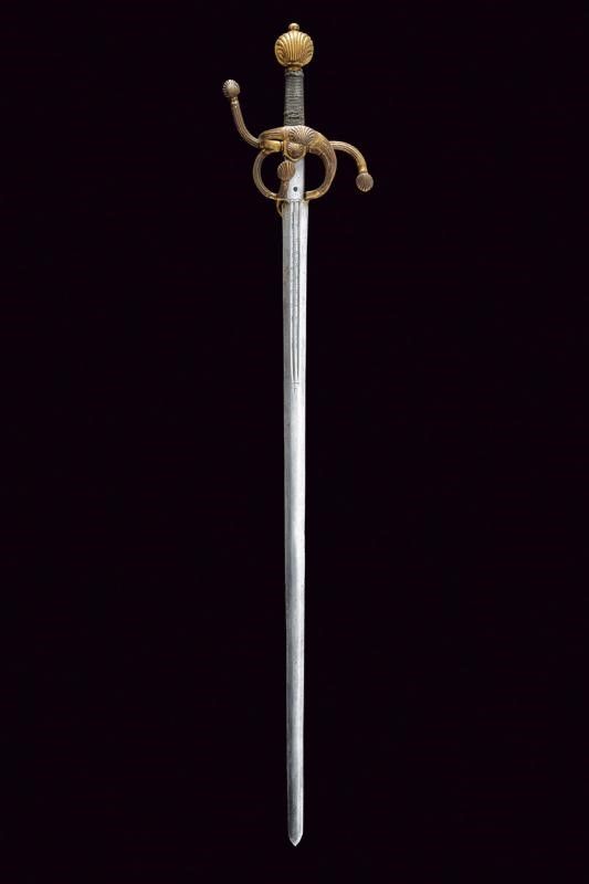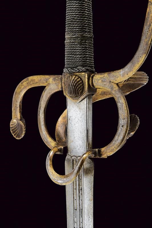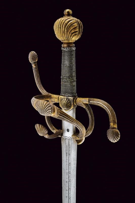 Italia settentrionale, lunghezza 114.5 cm. 1620 circa Lama dritta a due fili di sezione esagonale, con duplice scanalatura recante iscrizioni al forte; il tallone delineato e marcato con punzone a 'S' sotto a un cerchio entro un ovale. Bellissimo fornimento in ferro con resti di doratura (in parte rinfrescata), decorato su tutti gli elementi con conchiglie, i rami finemente scanalati. Impugnatura in legno rivestita con trecciola e munita di teste di moro in filo d'argento, al centro vecchio restauro.