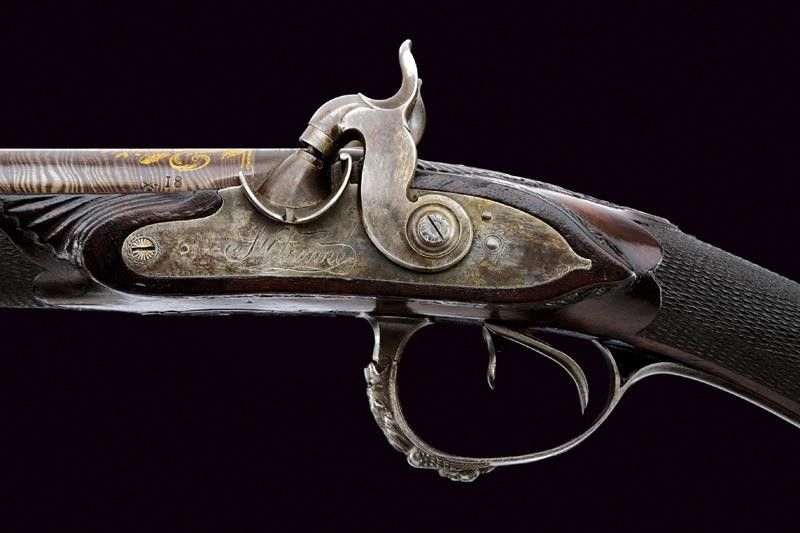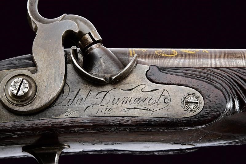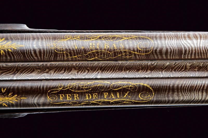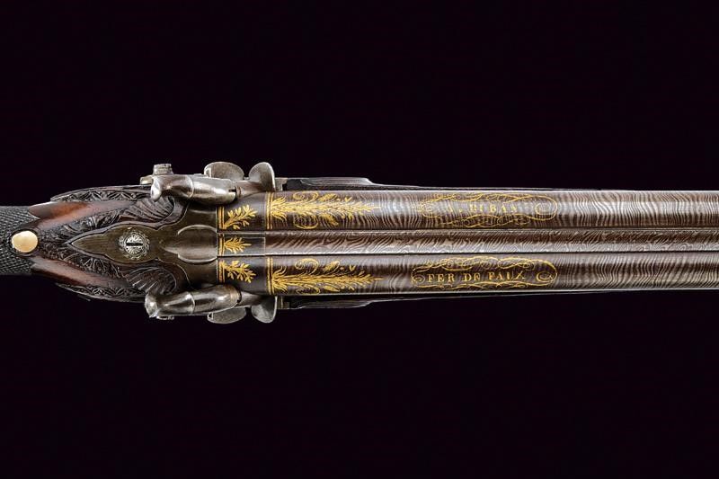 Canne lisce tonde, giustapposte, in damasco con bella brunitura, marcate nella prima parte 'A. RUBAN FER DE FAUX' e decorate a motivi floreali, tutto in oro. La bindella con mirino, cal. 17 mm. Codetta con traguardo a sella. Batterie a cartella piatta firmate 'Vital Dumarest & C.nie', le viti finemente intagliate. Mezza cassa in radica, astina e collo zigrinati. L'area attorno alle batterie e alla codetta finemente scolpita a palmetta e a motivi floreali. La parte inferiore della pala intagliata a testa di cinghiale (piccolissima mancanza). Fornimenti in ferro, il muso con piccola testa di mostro che ospita la bacchetta. Il ponticello con figura alata in rilievo.