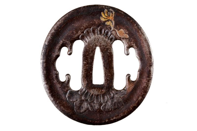 Giappone, dimensioni 7.6 x 8.1 x 0.4 cm. Periodo Edo (1603-1867) In ferro, tate-maru-gata con superficie ondulata verso il bordo a formare un leggero abbassamento in corrispondenza del mimi. La decorazione consiste sull'alto in un ramo di fiori di Paulownia incisi e decorati in nunome d'oro, sul basso in foglie di pawlonia con nunome d'argento, il nakago ana è incorniciato da sopra e sotto con petali di crisantemo.
