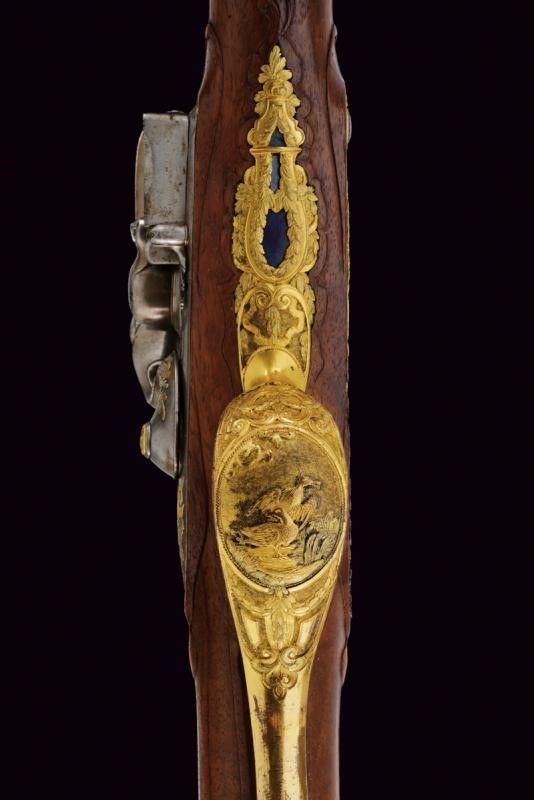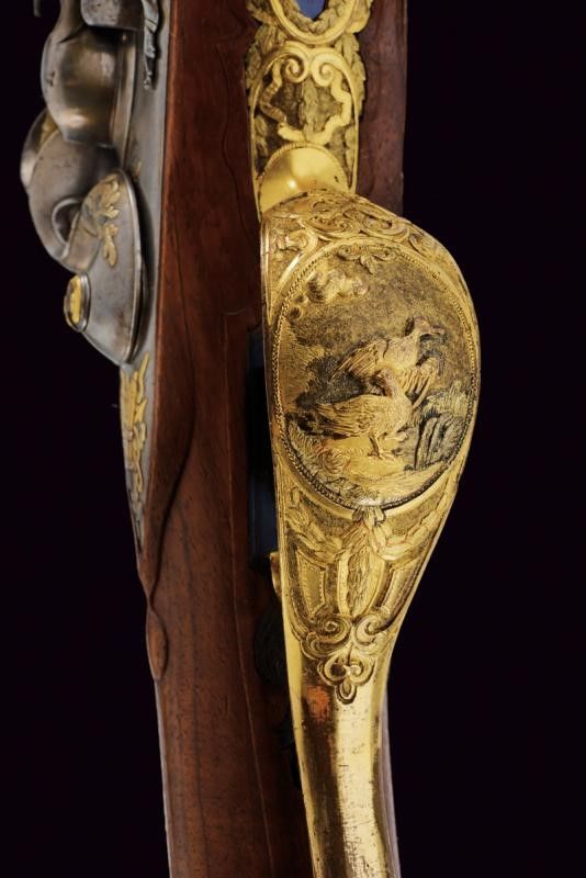 Canna tonda liscia, a due ordini, con anellature al cambio, brunita (finitura rinfrescata), con punzoni dorati della Real Fabbrica di Napoli tra gigli alla culatta, dotata di mirino in argento a coda di rondine, cal. 16 mm; codetta incisa, dorata e marcata '44'. Batteria a cartella leggermente tondeggiante, decorata a motivi floreali con faretra e frecce in oro ed argento nello stile di Tula. Mezza cassa in legno, magistralmente scolpita, recante finissimi intagli floreali, sul lato esterno del calcio tralci di vite. Straordinari fornimenti in bronzo dorato al mercurio, in parte traforati e foderati da placche in ferro azzurrate a specchio, lungo ponticello con uccelli in bassorilievo su fondo granulato, contropiastra formata da bande di foglie e ghirlande, coccia con trofeo, scudetto con monogramma 'FW' sotto ad un elemento decorativo in ferro fra trofei, catena e drago in bronzo dorato al mercurio. Bocca in corno scuro, fascetta reggicanna e reggibacchetta in bronzo dorato, decorate en suite. Bacchetta in legno con mancanza.