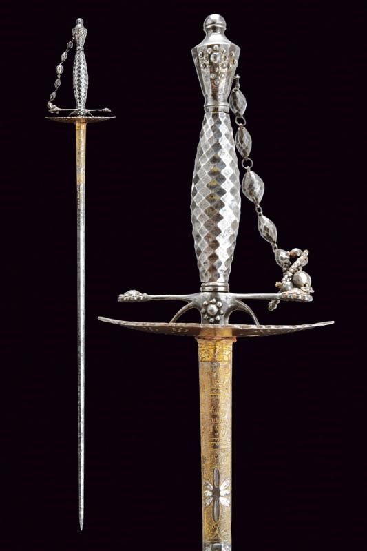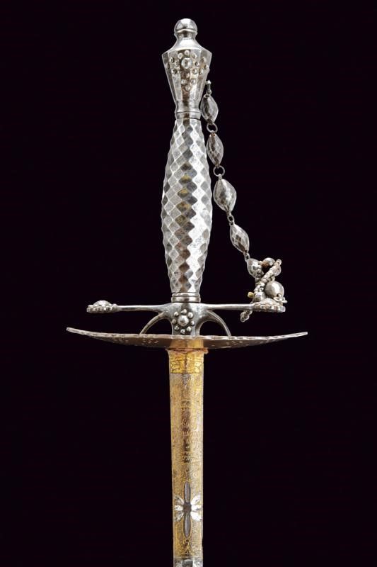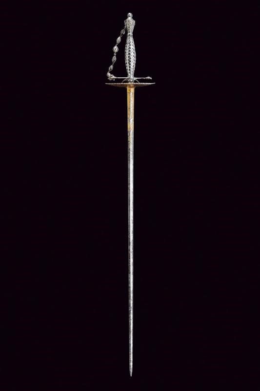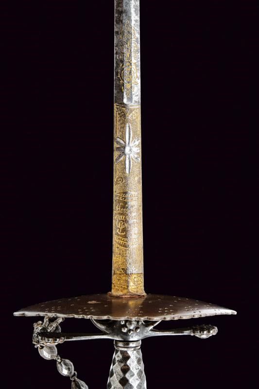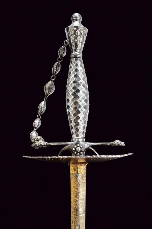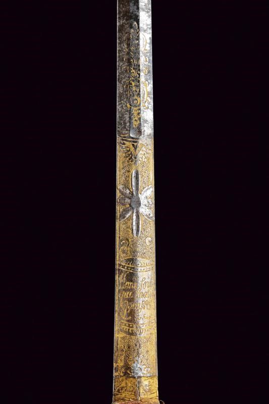 Inghilterra, lunghezza 84 cm. 1800 circa Lama dritta a due fili di sezione esagonale, incisa e dorata al forte a motivi floreali e geometrici con motto 'Honi soit chi mal y pense'. Fornimento in acciaio massiccio con valva ellittica traforata, elso e pomo decorati con perline d'acciaio, impugnatura decorata a losanga e completa di catenina.