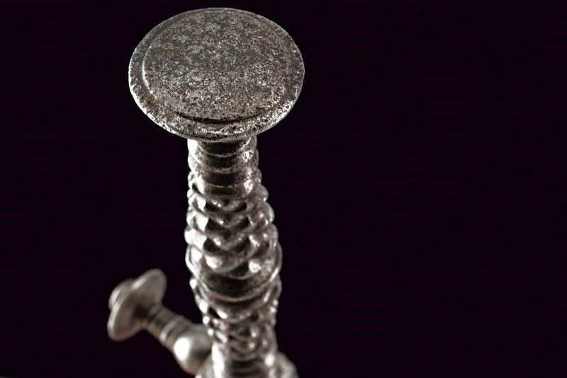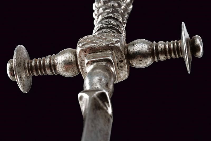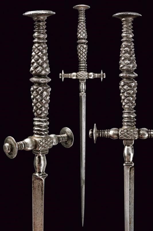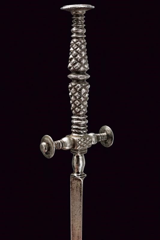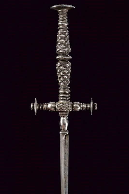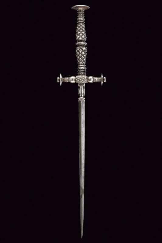 Italia, lunghezza 28.7 cm. XVII Secolo Lama dritta di sezione triangolare. Il nodo ovoidale. Fornimento in ferro massiccio. Corti bracci dell'elso con testa a disco come anche il pomo, che è anche inciso. Massello rettangolare intagliato a rombi. Impugnatura a settori granulati e a dischi.