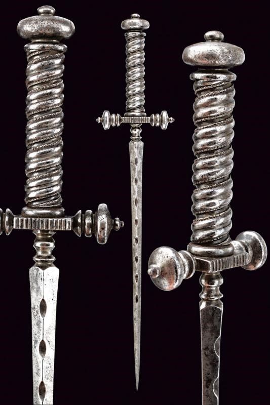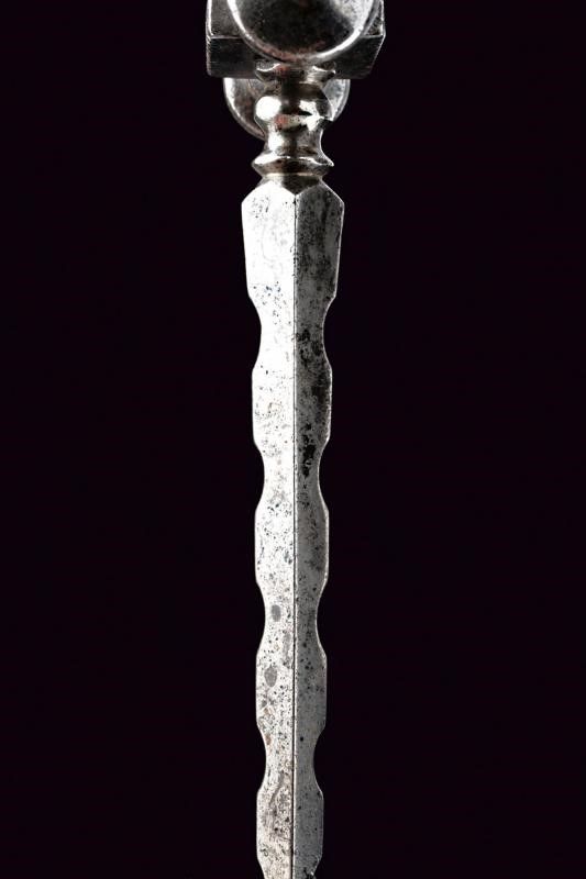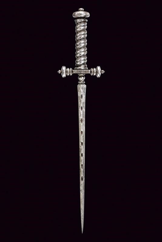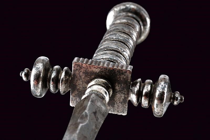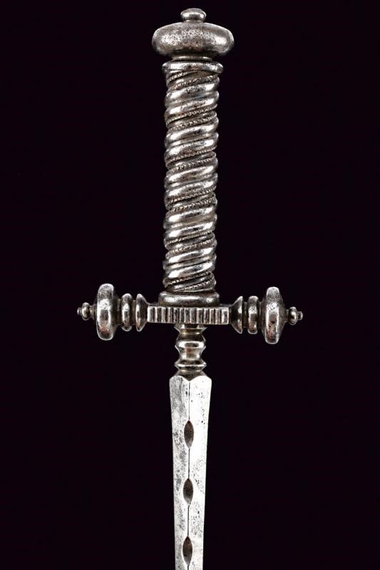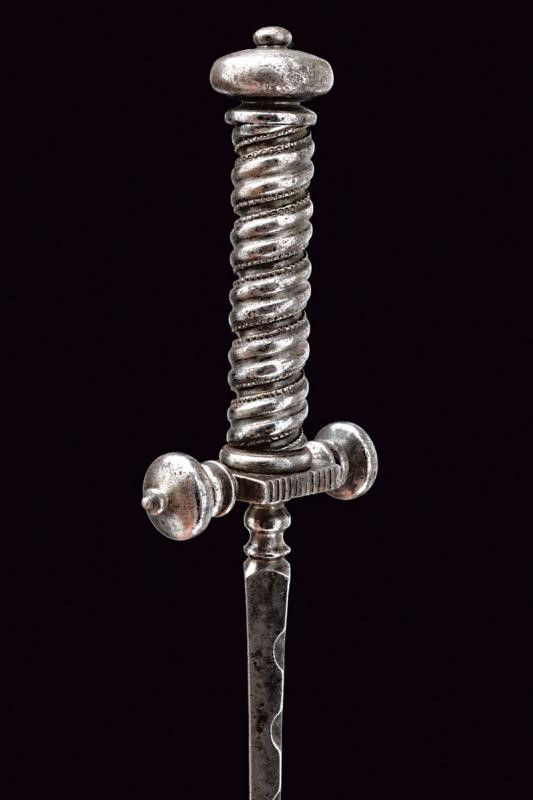 Italia, lunghezza 31 cm. XVII Secolo Lama dritta a sezione di losanga con intagli a onde sugli angoli e con marca alla base. Fornimento in ferro massiccio con corti bracci dell'elso terminanti a dischi come anche il pomo. Impugnatura a colonna tortile intagliata a spire lisce.