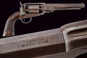 1861 - 1862 Canna ottagonale da 8', rigata (qualche segno d'uso all'interno, rigatura visibile), marcata alla base 'B. F. JOSLYN / PATD. MAY 4th, 1858', mirino, cal. 44. Tamburo liscio a cinque colpi. Meccanica funzionante. Castello liscio con punzone '2' in basso. Side hammer. Ponticello in ferro (la vite di tenuta posteriore ha ceduto leggermente). Guancette in legno con segmento zigrinato al centro, una con tacche, apparentemente non casuali, al bordo inferiore. Matr. '4xx' all'interno dell'impugnatura. Superfici sostanzialmente ben conservate con qualche lievissima intaccatura.