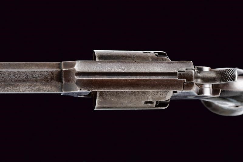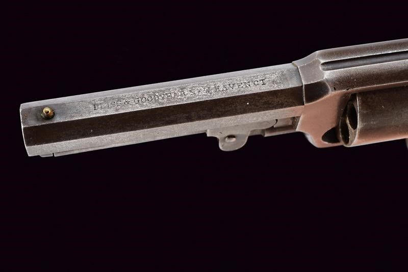 USA, lunghezza 17,8 cm. 1860 circa Canna ottagonale (segni d'uso all'interno, rigatura visibile) con mirino conico, recante resti di marcatura 'BLISS & GOODYEAR NEW HAVEN CT.' cal. 28. Tamburo a sei colpi. Meccanica funzionante. Castello con grilletto a sprone. Matr. '2xx' sul lato inferiore della canna, tracce della stessa numerazione sotto all'impugnatura. Resti di finitura color blu antica. Impugnatura con guancette in legno.