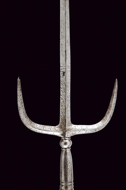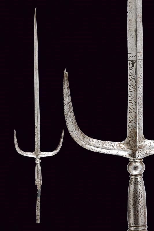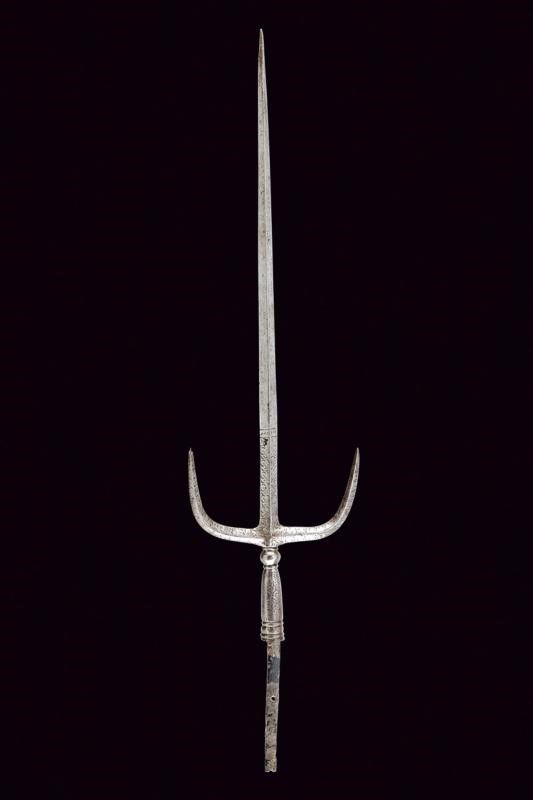 Italia, lunghezza 66 cm. 1600 circa In ferro, con cuspide di sezione a losanga munita alla base di due ali incurvate verso l'alto (piccola mancanza su una punta). Gorbia di sezione tonda sormontata da bottone sferoide. La base della cuspide, le ali e la gorbia con incisioni a fogliame. La cuspide munita anche di un punzone. Resti di una sola bandella.