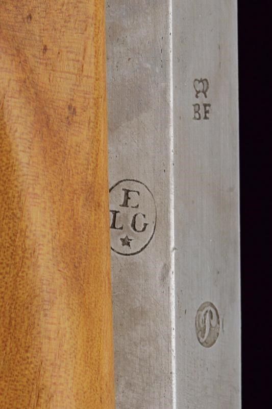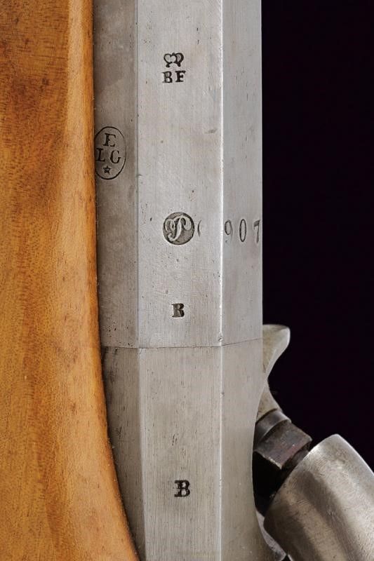 Liegi, lunghezza 132 cm. Canna rigata (anima pulita, rigatura visibile), tonda, con base ottagonale marcata 'BF' sotto corona, 'B', 'P' e con numero '907', mirino, cal. 9.5 mm; lunga codetta liscia. Batteria a molla in avanti firmata 'BEURET FRERES LIEGE' e con punzone 'BF' sotto corona; cassa intera in legno chiaro con fornimenti e bacchetta in ferro. Probabilmente mai usata.