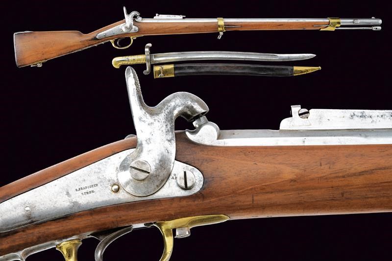 Canna tonda con base ottagonale, rigata (anima con pitting, rigatura non più visibile), con culatta marcata 'FRANCOTTE LIEGE', 'ED 1856', 'A', punzone del banco di prova di Liegi e vari altri punzoni, munita di alzo regolabile fino a '1000' e abbattibile, dotata di guida per la baionetta (marcata '5308'), cal. 17.7 mm. Batteria a molla indietro firmata 'A. FRANCOTTE LIEGE'; cassa intera in legno con fornimenti in ottone e ferro. Il calciolo marcato '13 C.B.C. 8. C 30' e con punzone. La guancia sinistra marcata 'TO 1856'. Bacchetta in ferro. Completa della sua baionetta, la lama marcata 'V.W' e 'C', crociera in ferro marcata '13. B.C. 1.C. 128', con fodero e fornimenti in ottone.