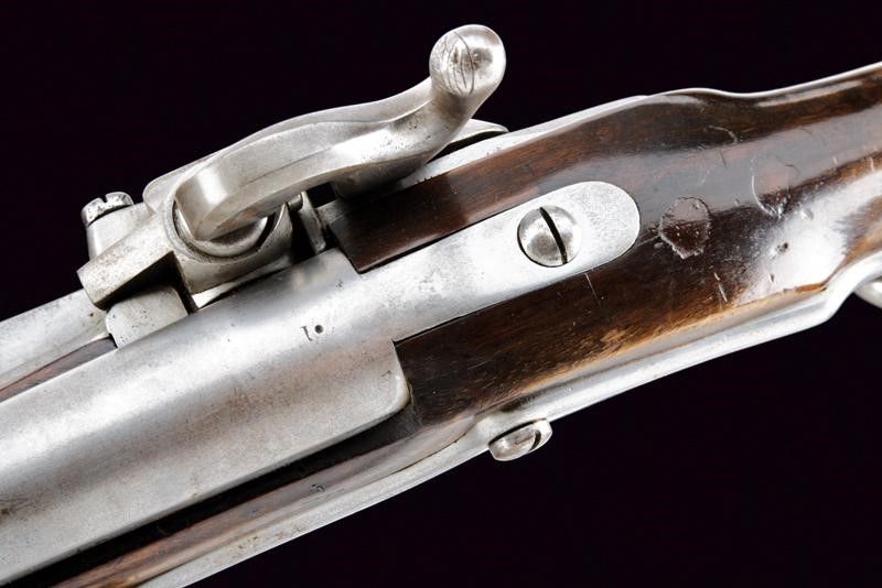 Austria, lunghezza 75.5 cm. Canna liscia, corta, tonda, con base quadra avente resti di marcature su entrambi i lati, cal. 17 mm; codetta liscia. Batteria a molla in avanti con sistema Augustin, cartella con data '853'. Cassa in legno con fornimenti in ferro. Anello da sella. Rara.