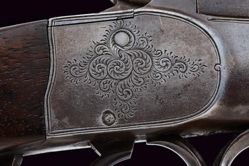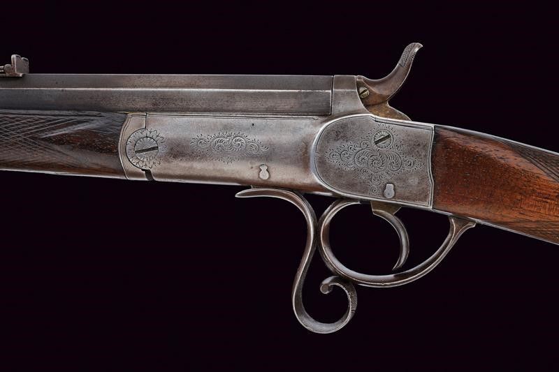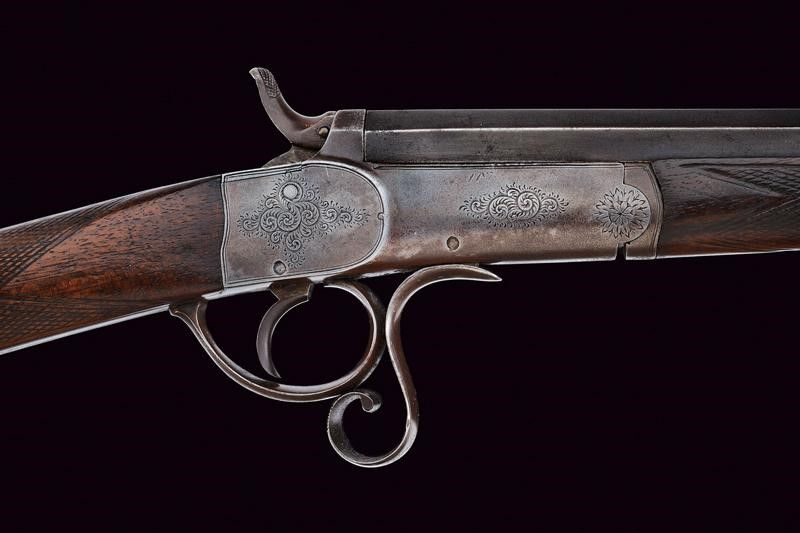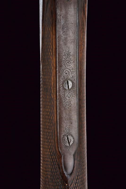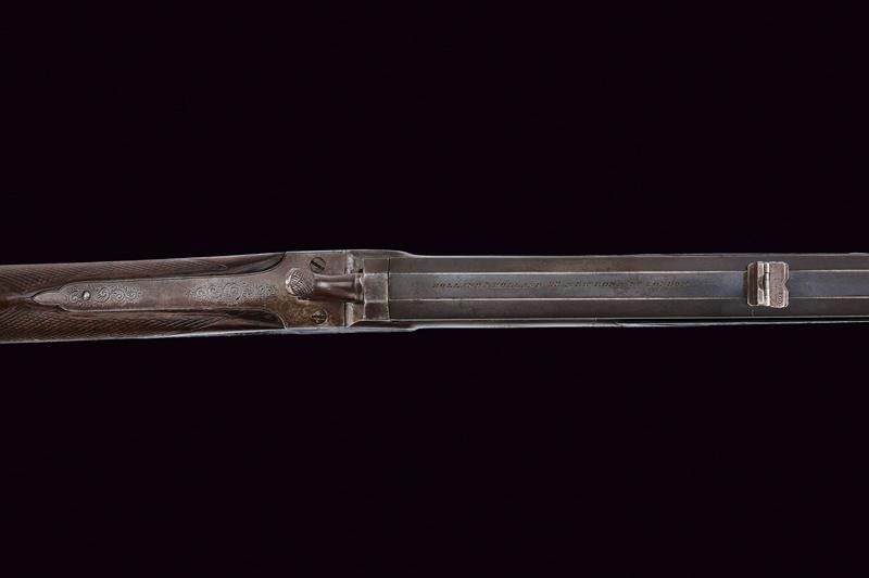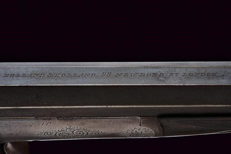 Canna ottagonale rigata, dotata di alzo a tre fogliette abbattibili marcate da '50' a '100', recante firma al dorso 'HOLLAND & HOLLAND 98 NEW BOND ST. LONDON', recante in basso punzoni del banco di Londra e marcatura '100', cal. 38 in volata. Anima pulita, rigatura visibile, minimi segni d'uso. Castello e bascula in un unico pezzo, con incisioni a racemi. Meccanica funzionate. Calcio ed astina in legno, entrambi zigrinati. Fornimenti in ferro con qualche intaccatura. Davanti al ponticello la leva di sblocco della bascula. Resti di finitura antica.