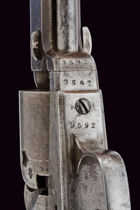 1854 Canna ottagonale da 4', dotata di basso mirino circolare in ottone, rigata (rigatura visibile, leggero pitting), recante marcatura dorsale in due righe fra parentesi graffe 'ADDRESS COL. COLT / LONDON', cal. 31. Matricola su canna e calcatoio coeva al castello, fermo con matricola parziale coeva. Punzoni del banco di Londra. Tamburo a cinque colpi con resti di scena di attacco alla diligenza, visibile 'COLTS PATENT' e matricola parziale coeva, punzoni del banco di Londra. Castello con 'COLTS PATENT, matricola '35xx' presente anche sul perno del tamburo. Meccanica funzionante. Tipiche bande dell'impugnatura in ferro, della seconda produzione londinese, con matricole coeve. Qualche intaccatura. Impugnatura in noce.