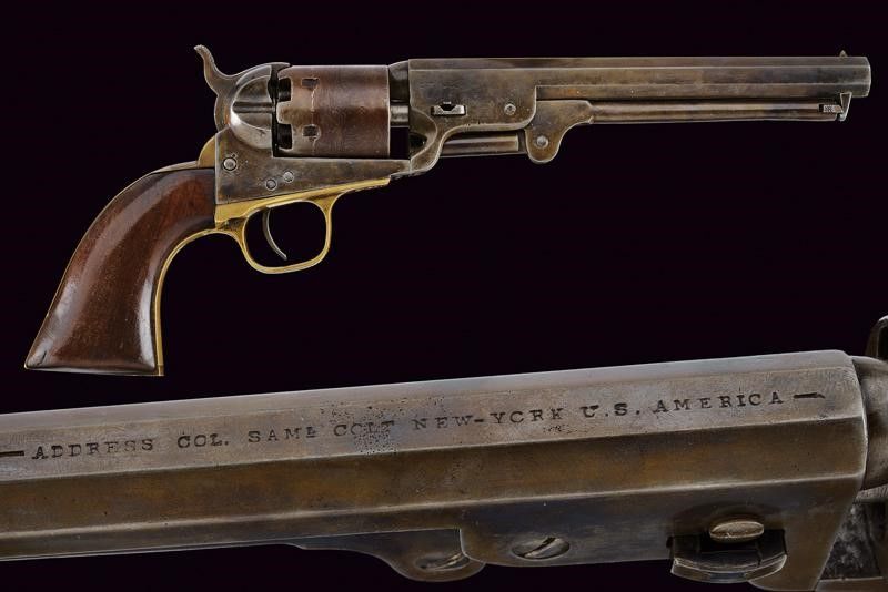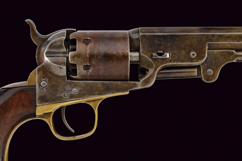 Seconda metà del XIX Secolo Canna ottagonale da 7-1/2' rigata (interno con pitting e alcune incrostazioni, rigatura visibile), dotata di mirino conico in ottone, recante marcatura dorsale 'ADDRESS COLT SAM.L COLT NEW-YORK U.S. AMERICA', cal. 36. Tamburo con resti della scena di battaglia navale fra Texas e Messico. Meccanica funzionante. Castello con resti di marcatura 'COLTS PATENT'. Bande dell'impugnatura in ottone. Ponticello del tipo tondeggiante e ampio. Resti di finitura (probabilmente più tarda) su tutte le parti in ferro. Numeri di serie (ritimbrati?) coevi su tutte le parti. Impugnatura in noce con crepa su un lato. Quarto Modello.