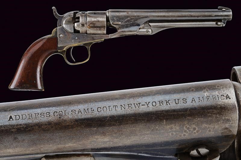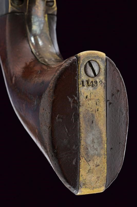 1862 Canna tonda da 6-1/2' rigata (lievi intaccature all'interno, rigatura visibile) con marcatura dorsale standard, mirino a vela brunito, cal. 36. Matricola coeva al castello, il fermo con matricola parziale coeva. Tamburo del tipo sgusciato e ribassato, a cinque colpi, recante resti di marcatura del brevetto. Meccanica funzionante. Castello marcato 'COLTS PATENT', con matricola '11xxx'. Bande dell'impugnatura in ottone entrambe con numerazione coeva. Resti di argentatura all'impugnatura. Resti (circa il 20%) di brunitura su canna e tamburo, il castello con lievi tracce di tartarugatura. Qualche intaccatura. Impugnatura liscia in noce.