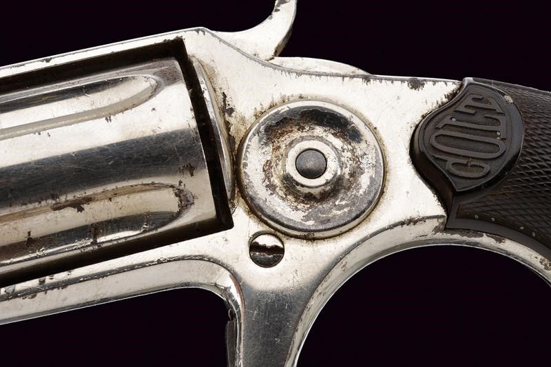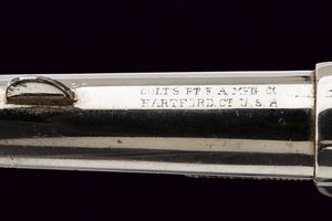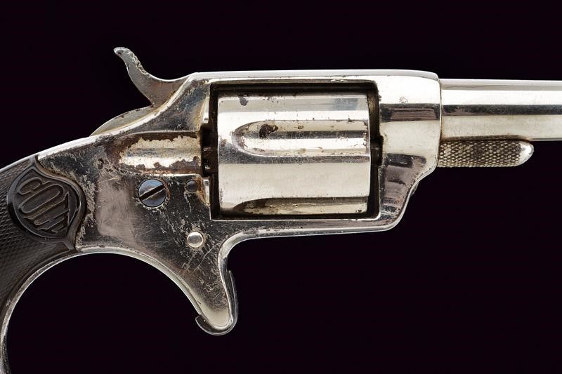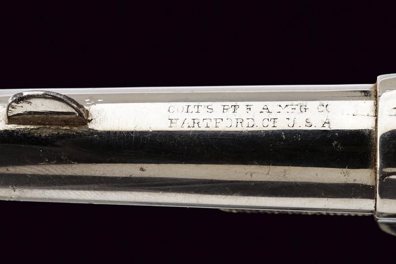 USA, lunghezza 15,5 cm. 1873 - 1884 Canna tonda rigata (anima con segni d'uso, rigatura visibile) recante resti di marcatura della ditta. Cal. 32 centerfire. Tamburo a cinque colpi. Castello con grilletto a sprone. Guancette in gommadura zigrinata con marchio 'COLT'. Meccanica funzionante. Segni d'uso e del tempo. Nichelatura con qualche intaccatura.