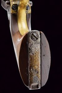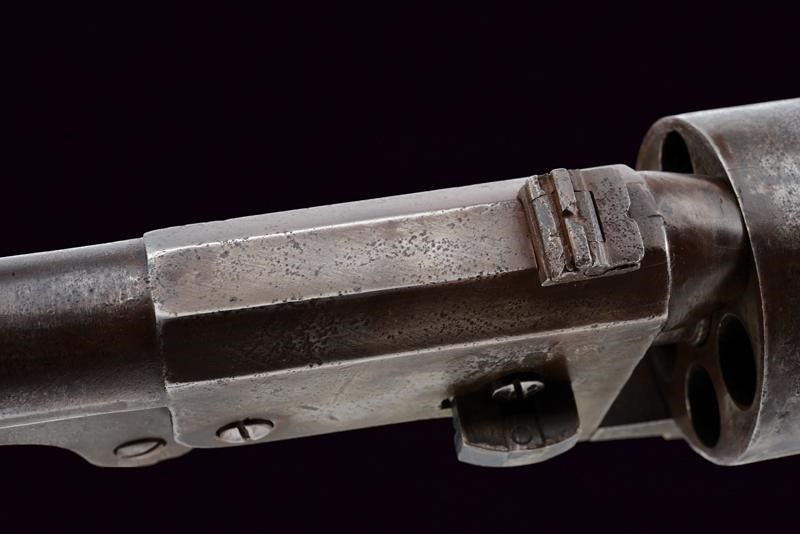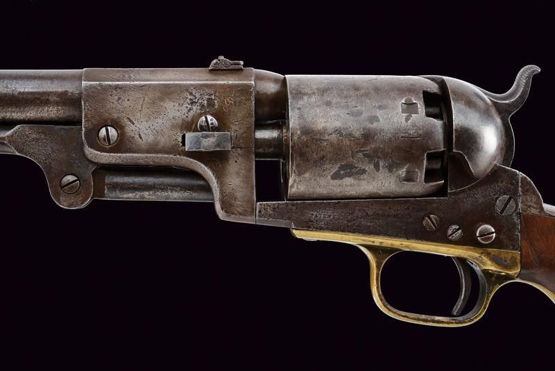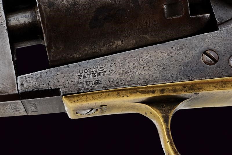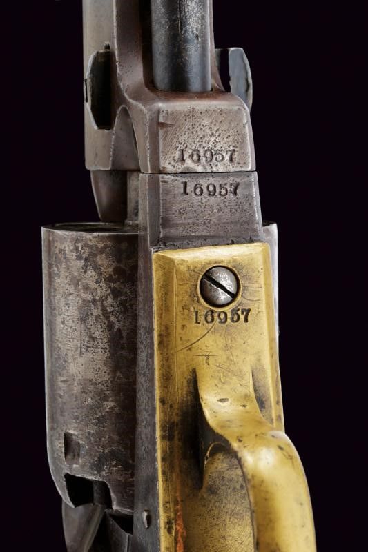 1858 Canna cilindrica da 7-1/2' (qualche incrostazione e intaccatura all'interno, rigatura ben visibile) con base ottagonale, dotata di mirino a semicerchio color argento, marcatura dorsale mancante, cal. 44. Al dorso, vicino alla culatta alzo con foglietta abbattibile. Il calcatoio con matricola parziale a quattro cifre coeva alla canna. Fermo della canna non numerato. Tamburo liscio a sei colpi con tacche rettangolari, privo di marcature o decorazioni (due camere leggermente deformate, sostituito?). Meccanica funzionante. Castello marcato 'COLTS PATENT' e 'U.S.' con matricola '16xxx' coeva alla canna; Il perno centrale del tamburo senza numeri. Banda inferiore e ponticello (del tipo arrotondato) in ottone con matricola coeva al castello, recante anche il punzone 'L'. Banda dorsale in ferro con matricola coeva sotto all'impugnatura. Presenta attacchi sui fianchi e scasso sotto all'impugnatura per il montaggio di un calcio rimovibile (non presente). Varie zone di pitting. Impugnatura liscia in noce senza timbri.