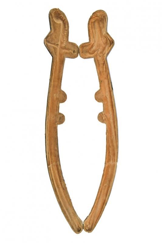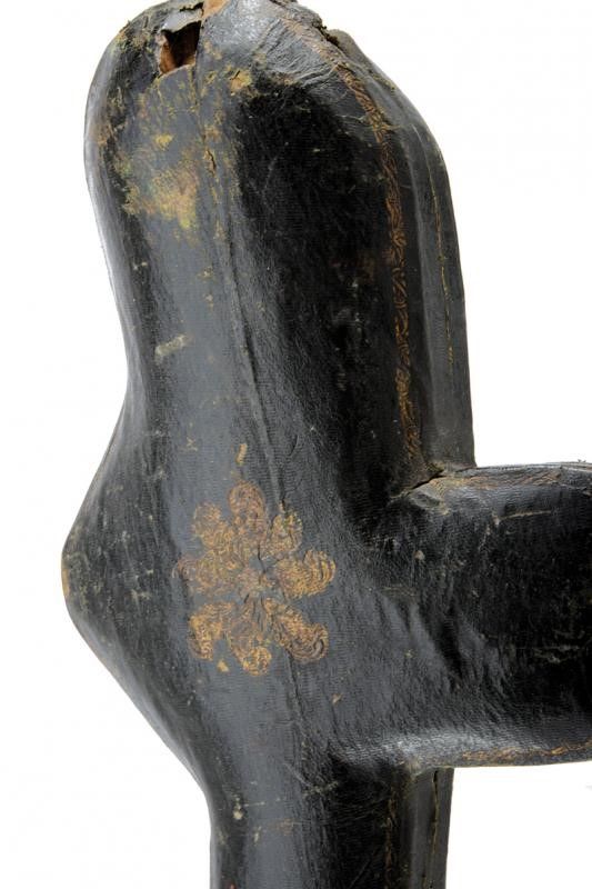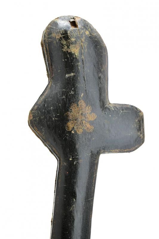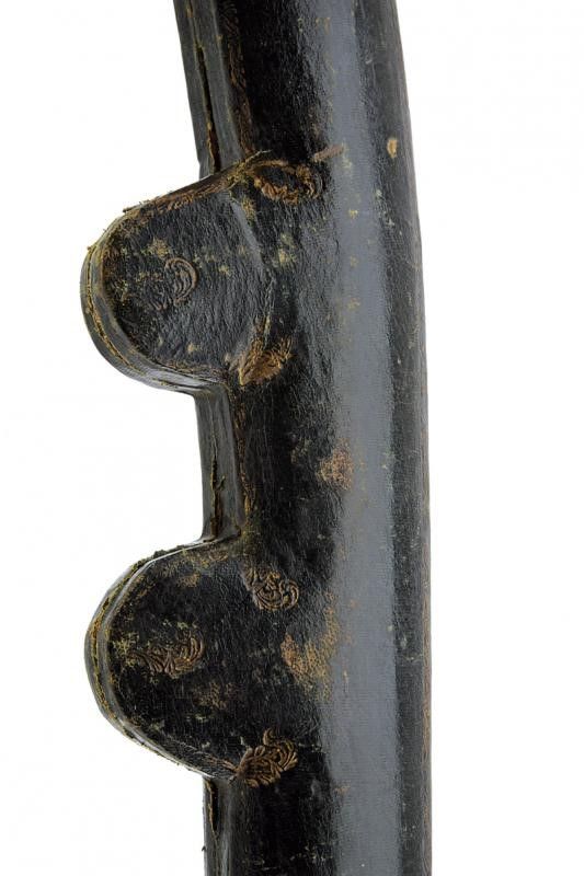 In legno rivestito di cuoio verde bottiglia decorato a motivi floreali in oro. L'interno foderato in velluto marrone. Quasi sicuramente realizzata per ospitare una sciabola all'orientale. Segni del tempo e d'uso. Rara.