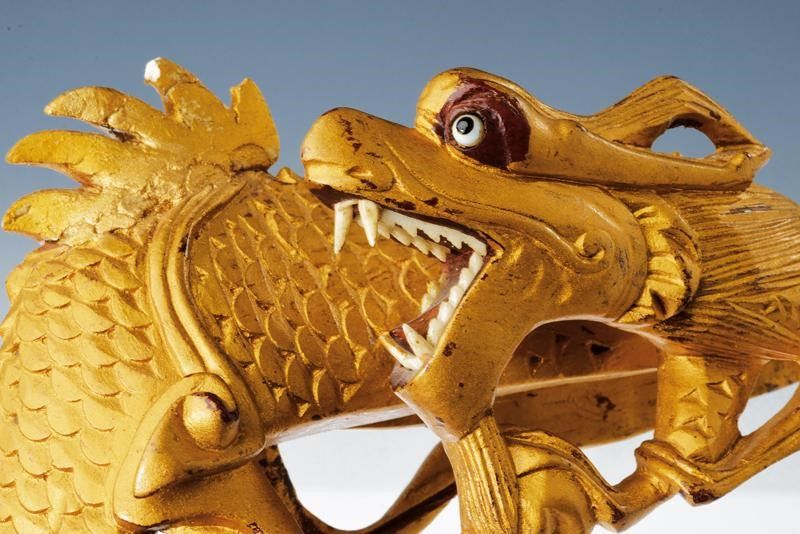 Giappone, altezza 27 cm. Periodo Edo (1603-1867) Coppo in ferro di forma tipica con lacca marrone, Mabezashi con Mayo, completo di Maedate (recente) in legno dorato intagliato nelle forme di un drago. Hineno-shikoro a cinque lame sempre laccate marrone con allacciatura Kon-ito Sugake Odoshi. Interno con cuffia azzurra in cotone trapuntato.