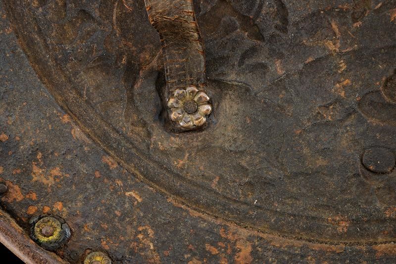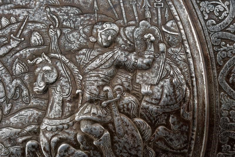 Italia settentrionale, diametro 56 cm. 1620 circa In ferro, di forma circolare e convesso, con bordo rilevato e lavorato a fingere il tortiglione. Maestosamente sbalzato ed inciso in rilievo con una scena di battaglia in primo piano con guerrieri a cavallo ai piedi di una collina, questa sormontata da una roccaforte, nel cielo il sole e le nuvole. Bella esecuzione di armi ed armature. Il bordo ribassato e completamente decorato con ghirlande e motivi floreali. Giro di ribattini con resti di coietti sul retro. Il lato posteriore con due maniglie in cuoio fissate con rosette in ottone.