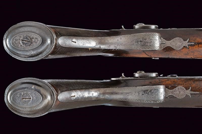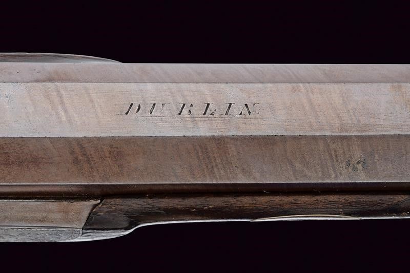 Lunghe canne ottagonali, lisce, damascate e brunite, marcate 'DUBLIN', con duplice cornice leggermente incisa e con conchiglia alla culatta, nella parte inferiore recanti punzoni del banco di prova di Londra, cal. 13 mm. Codette finemente incise a motivi floreali e con conchiglia. Belle batterie a luminello a molla in avanti, cartelle firmate 'KAVANAGH' e incise a motivi floreali, fini incisioni ai bordi che trasmettono un senso di continuità , codoli con sicura. Mezze casse in legno (piccoli difetti), interessanti calci obliqui zigrinati. Fornimenti in ferro incisi en suite. Sui dorsi scudetto rettangolare in argento. Grilletti con sensibilizzatore. Meccanica funzionate.