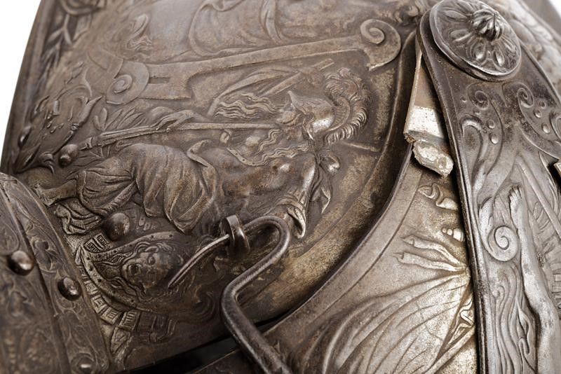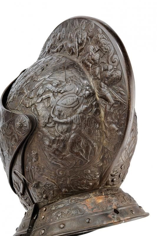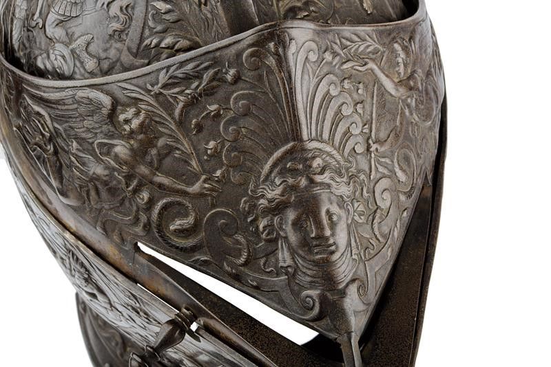 Realizzato in ghisa; tutta la superficie riccamente decorata, con raffigurazione di una battaglia all'antica e con effigi di varie divinità , trofei e fiorami. Visiera con rottura, il resto in buonissime condizioni.