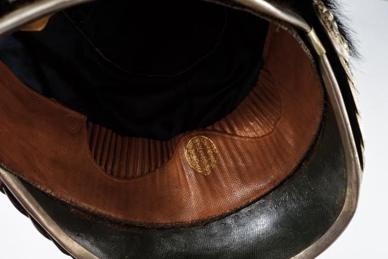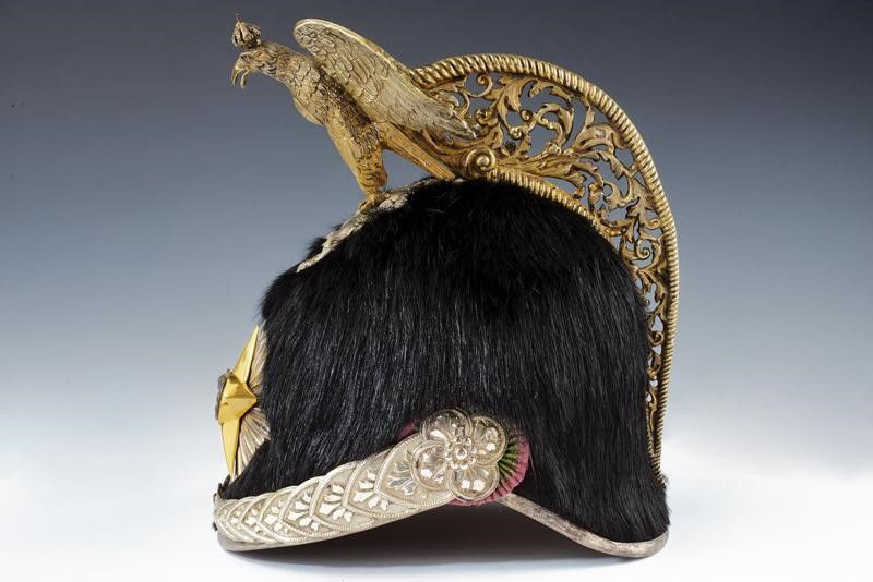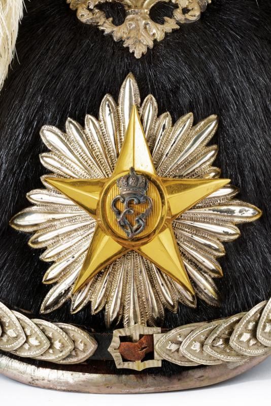 Regno d'Italia, altezza 30 cm. 1870 circa Coppo rivestito di pelliccia nera di foca vitulina, cimiero dorato messo a giorno su una base in argento sbalzata a fiorame recante i bolli dell'argentiere, aquila coronata in argento a tutto tondo. Raggiera in argento con piccola stella centrale dorata caricata con il tipico monogramma VE coronato (Re Vittorio Emanuele II, 1861-1878). Sottogola in argento a squame con rosoni lobati e coccarda tricolore in filo d'argento. Bell' interno con visiere in marocchino verde, alluda in cuoio marrone in parte plissettato recante impresso in oro il marchio del fabbricante londinese. Cuffie in seta blu. Pennacchio originale completo di pennacchiera dorata.