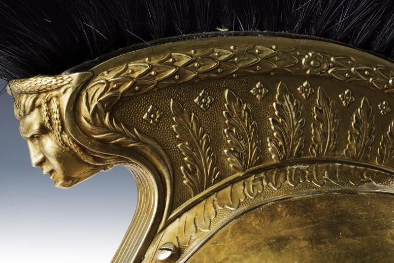 Francia, altezza circa 24 cm. Prima metà del XX Secolo Coppo in metallo color ottone con fornimenti in metallo bianco. Cimiero e coda in crine nero (mancanze). Soggoli in cuoio corazzati con scaglie in metallo e con grandi orecchioni lavorati a testa di leone. Interno con segni d'uso e del tempo. Cuffia in cuoio nero. Epoca Terza Repubblica.