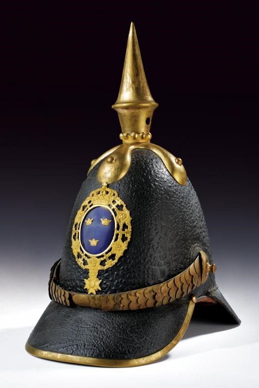 Svezia, altezza 36 cm. Metà del XIX Secolo Alto corpo in cuoio laccato di nero, cuspide liscia su base a croce, fregio anteriore svedese con tre corone su fondo smaltato di color blu. Soggolo a squame e coccarda sul lato destro. All'interno alluda in pelle (segni d'uso e del tempo). Molto raro.