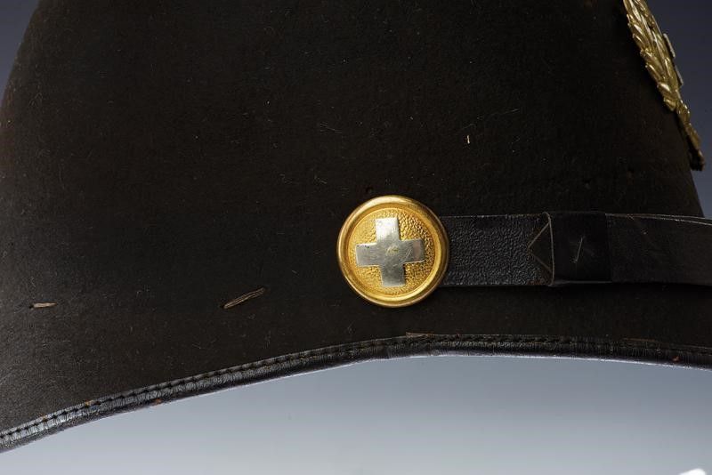 USA, altezza 24 cm. Fine XIX inizio XX Secolo Coppo semirigido rivestito di panno bruno. Fornimenti in metallo dorato. Cuspide sommitale con base a fronde di quercia. Fregio anteriore (un attacco rotto) ad aquila statunitense caricata con la croce di sanità in metallo bianco. Soggoli in cuoio con bottoni recanti la croce. Interno con fascia in tessuto e timbro del produttore direttamente sulla superficie interna.
