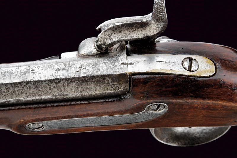 Austria, lunghezza 104.5 cm. Canna tonda rigata (anima con leggero pitting e rigatura ancora visibile), con culatta ottagonale recante tracce di marcature, alzo fisso, mirino, calibro 14.4 mm. Batteria a luminello a molla in avanti marcata '856' e con punzone imperiale, meccanica funzionante a un solo scatto. Cassa intera in legno. Fornimenti in ferro quasi tutti marcati '33'. Bacchetta in ferro con anello in ottone, anch'essa marcata '33'. Completo con una baionetta a ghiera con varie marcature, far cui '48. 8. 36.'
