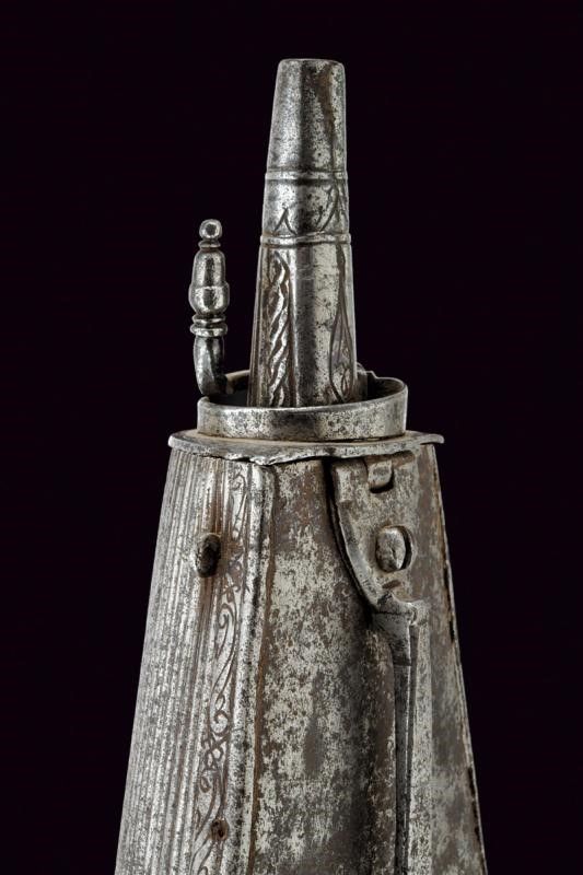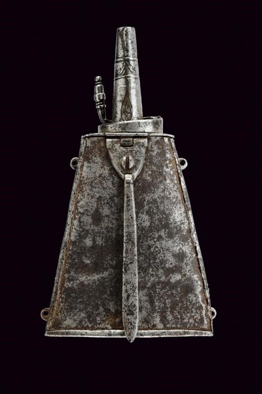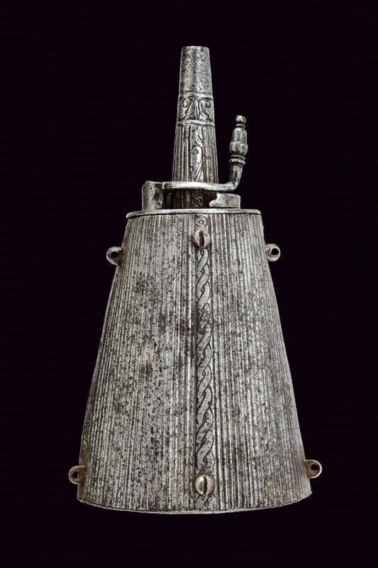 Corpo di forma troncoconica e piatto sul retro, decorato a scanalature longitudinali a mille righe con tre doghe incise a motivi floreali sulla faccia anteriore. La faccia del cannello incisa en suite con le doghe. La base del cannello troncoconica, lavorata come il serbatoio. Chiusura a vite con cerniera. Quattro anelli di sospensione.