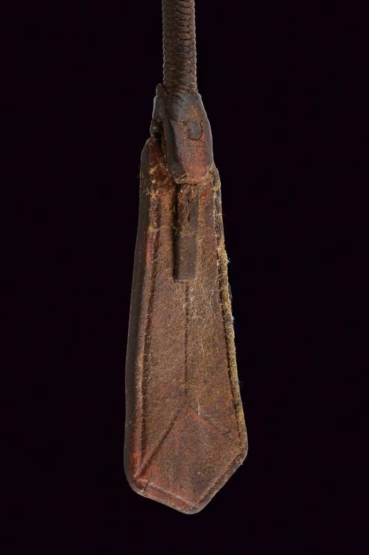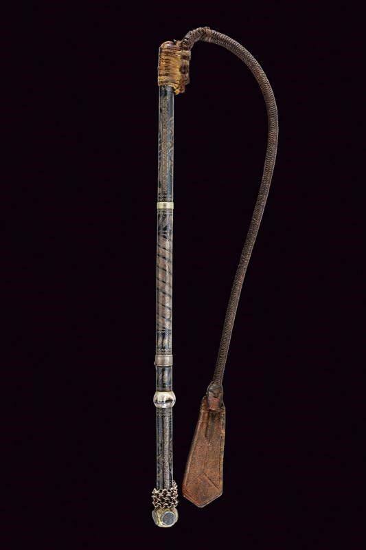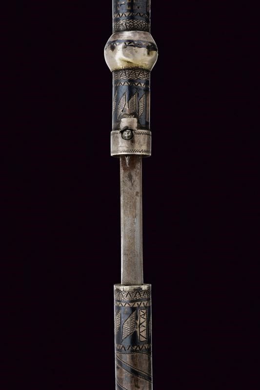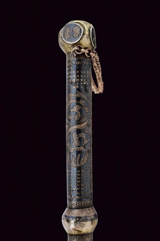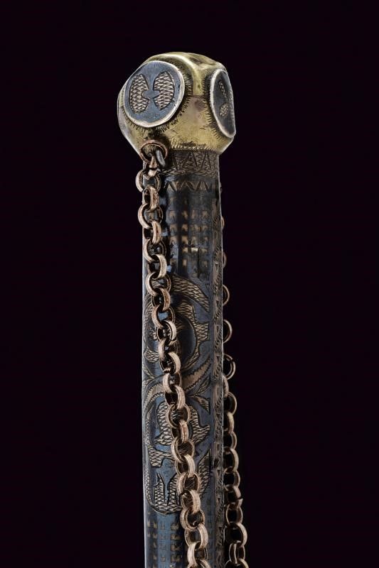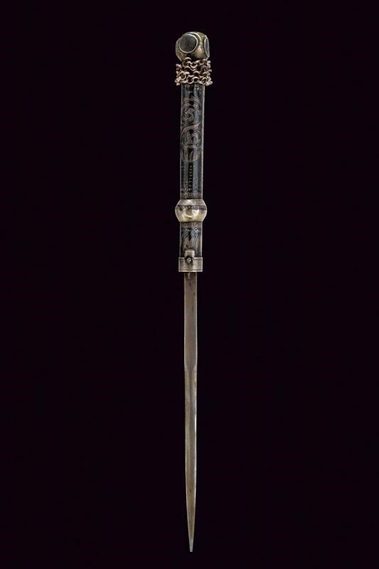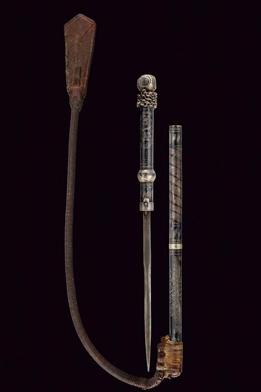 Caucaso, lunghezza 35.5 cm. Fine del XIX Secolo Lama a due fili costolata in mezzeria e con lungo tallone piatto. Impugnatura cilindrica rivestita con lamina d'argento incisa e niellata con simboli (o iscrizioni) e motivi geometrici. L'impugnatura con due sfere alle estremità . Catenina e bottone di apertura. Il fodero sempre cilindrico, in argento decorato en suite. Al puntale del fodero è montato un frustino da cavallo in cuoio. Raro.