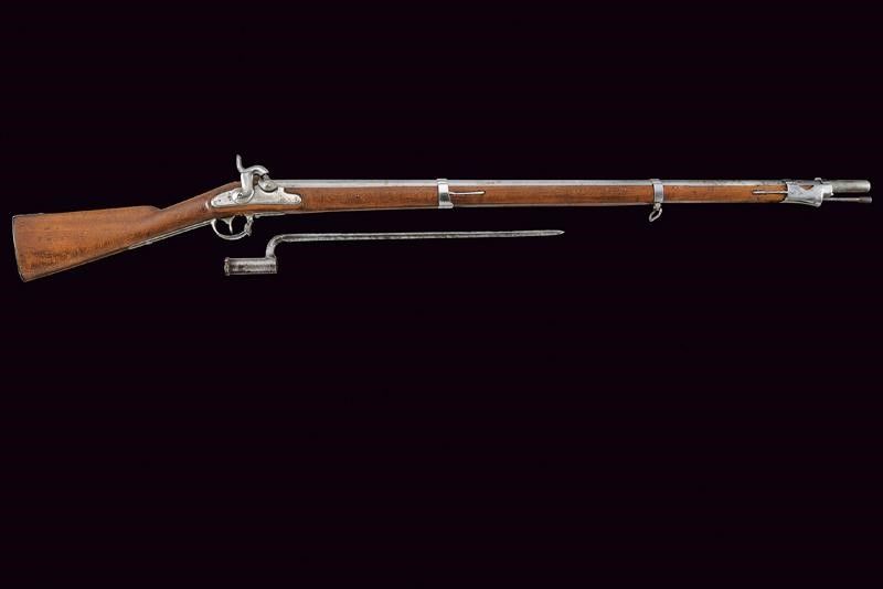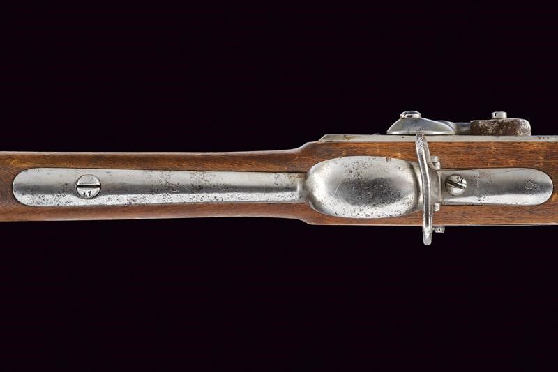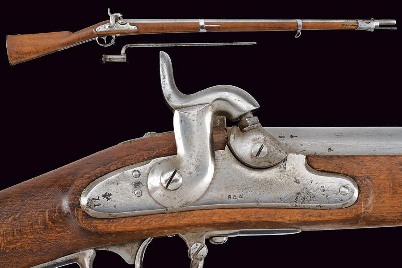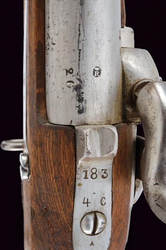 Canna liscia tonda marcata alla base 'R' sotto corona, '20' e con il punzone del banco di prova di Liegi, mirino e attacco per la baionetta, cal. 18 mm. Codetta marcata '183 4C A71' e munita di alzo. Batteria a molla in avanti datata '844', marcata 'A71' e con punzone imperiale. Cassa intera in legno, calcio numerato. Fornimenti in ferro, il ponticello marcato 'A71' e con un punzone. Bacchetta e baionetta in ferro.
