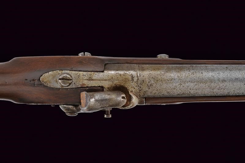 Austria, lunghezza 104 cm. Canna tonda, liscia, con base quadra, mirino e attacco per la baionetta, cal. 17 mm. Batteria a molla in avanti con cartella piatta e sicura. Cassa intera in legno con fornimenti e bacchetta in ferro.
