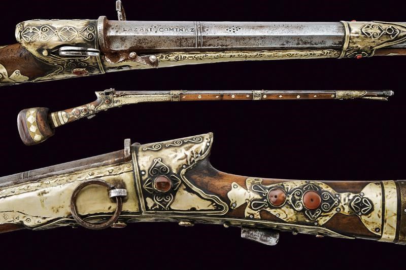 Yemen, lunghezza 150,5 cm. XIX Secolo Canna in ferro, ottagonale, marcata al dorso 'LAZARI COMINAZ' fra stelle, munita in culatta di alzo circolare privo di tacca di mira, in volata recante gioia di bocca intagliata a testa di mostro, con occhi in ottone, cal. 14 mm. Piccolo scodellino dotato di copriscodellino girevole. Meccanica con serpentina funzionante. Cassa intera in legno parzialmente rivestita con lamine in metallo bianco decorate in vari punti con volute in filigrana e con cabochon in pietra color rosso sul tipo della corniola. grilletto in ferro. Calcio di tipica forma. Testa della bacchetta con decoro simile alla volata della canna. Arabia del sud o India.