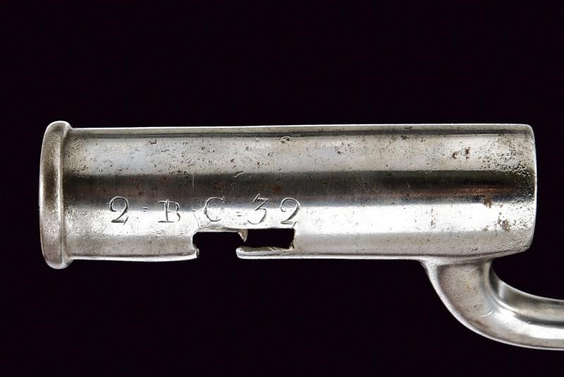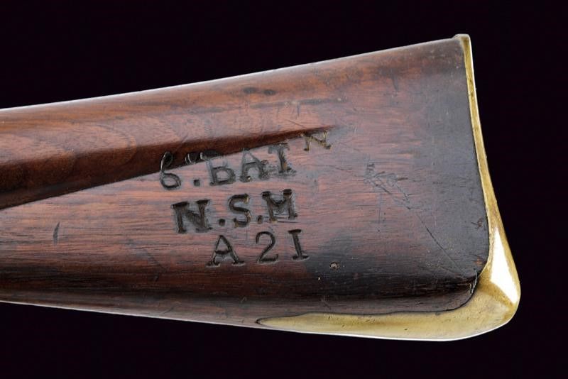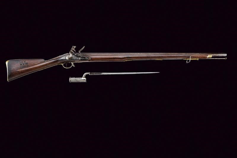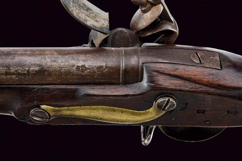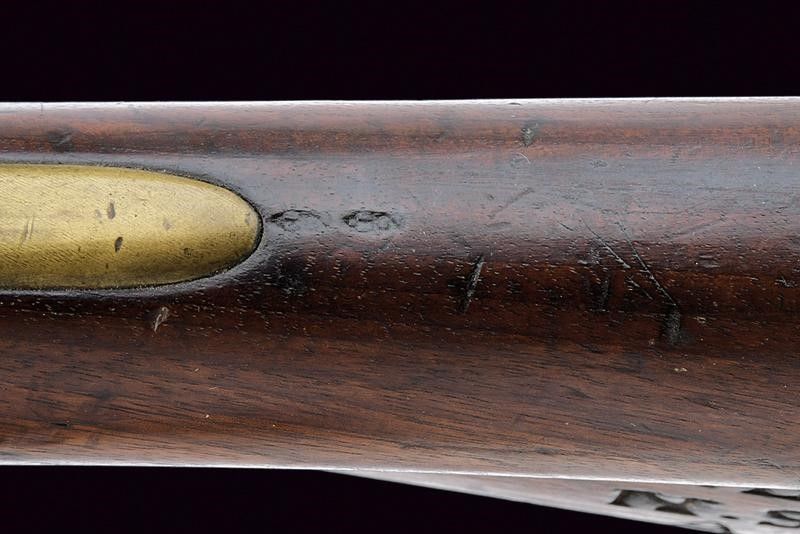 Canna liscia tonda, con culatta munita di cornice tonda e punzoni del banco di prova (GR sotto corona), dotata di mirino (che funge anche da attacco per la baionetta), cal. 18 mm; codetta con punzone '9' sotto corona. Batteria a pietra focaia marcata con 'GR' coronato, 'TOWER' e con broad arrow. I bordi del cane con doppie linee. Cassa intera in legno (crepa davanti al ponticello), il calcio marcato '6 BATT.N / N.S.M / A 2I'. Fornimenti lisci in ottone. Bacchetta e baionetta a ghiera in ferro (lunghezza 56 cm).