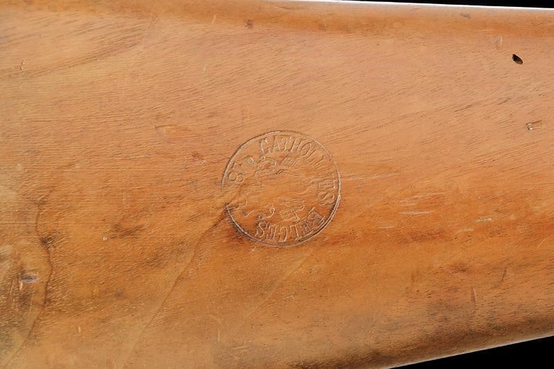Canna tonda rigata (anima leggermente impolverata con rigatura visibile) con base ottagonale marcata con punzone pontificio, punzone del banco di prova di Liegi, matricola '45xx' e con altri punzoni, poco più avanti la marcatura 'E. M. & L. NAGANT A LIEGE'; dotata di mirino, dente d'innesto per la baionetta, alzo abbattibile e regolabile, cal. 12 mm. Castello in ferro marcato 'BREVET REMINGTON', vari punzoni fra cui 'X' e 'S' sotto corona, matricola coeva alla canna. Otturatore a blocco rotante recante punzoni e numero di serie anch'esso coevo alla canna. Meccanica funzionante. Calcio ed astina in legno (un paio di fori di tarlo sulla calcio), ancora visibile sul lato destro della pala il timbro 'CATHOLIQUES BELGES' con data '1868'. Fornimenti e bacchetta in ferro. Insieme a una baionetta a yatagan (lunghezza 69.5 cm) con matricola coeva, fodero in ferro.